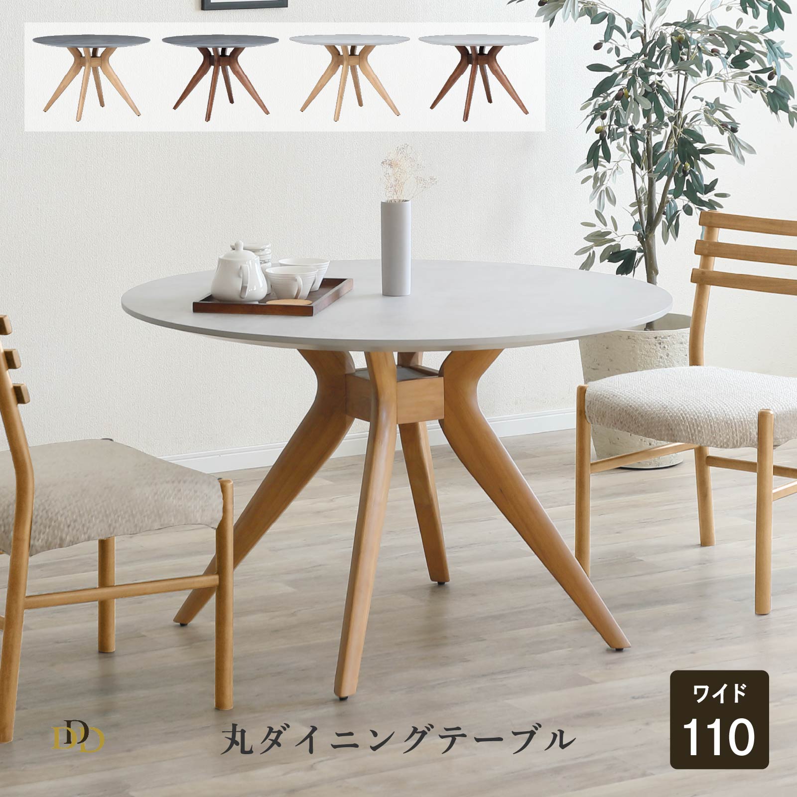 商品のご案内 110cm 幅 メラミン天板 円形 ダイニングテーブル (WH/DK) サイズ 幅 110 奥行き 110 高さ 70 cm 重量 32kg 素材 [天板] メラミン化粧合板[脚] ラバーウッド カラー WH (天板: ライトグレー調 | 脚: ベージュ)MBR (天板: ダークグレー調 | 脚: ブラウン) 耐荷重 --- 梱包サイズ 2つの梱包でお届けします。[天板] 幅 126 奥行き 126 高さ 7 cm (重量) 26kg[脚] 幅 75 奥行き 38 高さ 13.5 cm (重量) 8kg 備考 組み立て家具 (工具入り)表示のサイズは商品により多少の誤差を生じることがあります。掲載されている商品のカラー写真及びカラーサンプルについては、実際の色彩と多少異なる場合があります。あらかじめご了承下さい。 スタッフのおすすめポイント お部屋のダイニング空間をスタイリッシュにしたい でも 殺風景なものにはしたくない…そんなあなたにおすすめしたいのはこちらの 幅 110cm メラミン天板 x ラバーウッド クロス脚 円形 ダイニングテーブルです!天板にはマットな質感のメラミン天板を、脚には温かみのあるラバーウッド無垢材を使用。これらのコントラストがモダンかつ温もりのある空間を演出、さらに、開放的な クロス脚 が目を引きます。また、視線が自然と合う 丸型 のため、ダイニングがより賑やかな場所になります。 110cm 幅 のサイズ感は4人で囲むのにちょうどよく、中央に鍋を置いても一人分の食事スペースを確保できます。角がないので3人など奇数でもバランスよく座れて、来客の際はスツールなどコンパクトな椅子を合わせれば5~6人でもご使用になれます。 天板に使用されている 高品質 メラミン 化粧合板。この素材の魅力は、熱や傷に強いという点です。セラミックと似た頑丈さを有しつつ、より軽量。水や汚れにも強いため、お食事の際に食べこぼし・飲みこぼしをされても、さっと拭き取り、乾拭きをするだけできれいで清潔な状態を保てます。アルコール消毒も可能で、塗布後、さっと乾拭きすれば大丈夫です。デザイン面では「底板加工」を採用、厚みのないすっきりとした印象です。また、表面硬度が高いため、本物のモルタルのようなムラのある色味や、凹凸感のある手触りが特徴です。よって、書き物をされる際は下敷きをご使用くださいませ。光の当たり方で見え方が変わることも特徴です。 次に、脚は ラバーウッド 無垢材 を使用した クロス脚 を採用。見る角度によって異なる印象を与えるデザイン性と足元の広さがポイントです。圧迫感が少なく、スタンダードな4本脚と比べ、どこからでも座りやすい構造です。アジャスターもついているため、床との隙間やガタつきの微調整が可能、カーペットに乗せても安定して使うことができます。 110cm 幅 メラミン天板 x ラバーウッド クロス脚 円形 ダイニングテーブル は、おしゃれさとお手入れのしやすさが特徴の当店おすすめ商品です。お手入れの容易さ、日常使いのしやすさが満載です。ぜひ、このテーブルをあなたのダイニング空間の一員にし、もっと素敵で快適なお食事の時間を満喫しましょう。おすすめアイテム