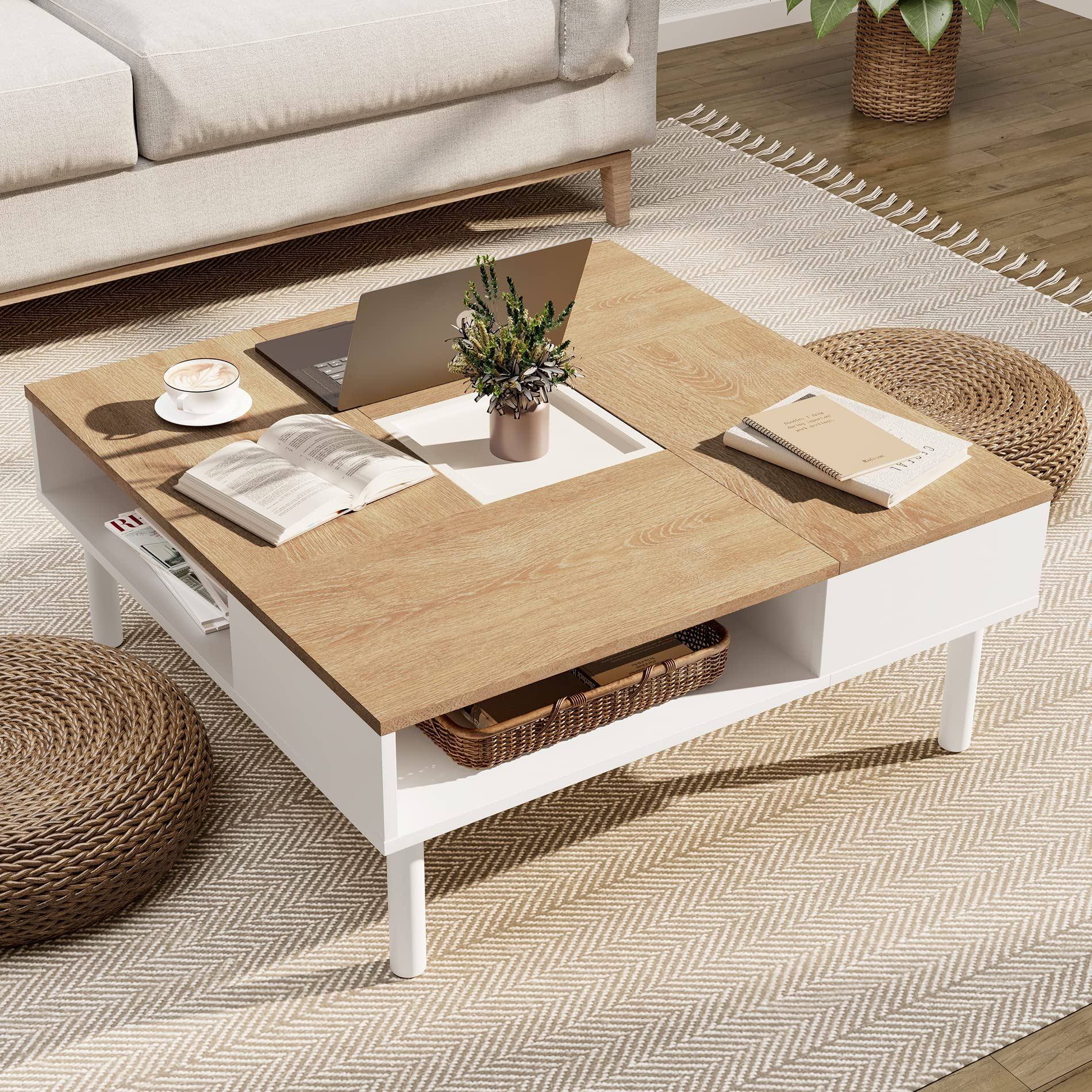 ・★★【商品仕様】テーブルのサイズ:幅80cm×奥行80cm×高さ33cm 重量:20kg 全体耐荷重49kg;各天板耐荷重6kg、中央カバー耐荷重2.3kg 梱包サイズ:69.5*34.5*25.7cm、梱包重量:22.5kg。素材:高品質パーティクルボード。・★【スマートデザイン】ローテーブルの中央部分のカバーを使用しない場合は、その中に好みな鉢植えをいれてもよくて部屋に色を増えています。カバーを使用する場合は、カバーの両面が使い可能、ご自由に使用してください。・★【独特の美しさ】座卓の天板は四つの高級な木目の板を接合して、幾何学的な美しさを与えます。普通のコーヒーテーブルと比較して、このローテーブルは正方形で、和室の雰囲気に合わせて、おしゃれな部屋を作り出します。・★【収納力抜群】センターテーブルの四面それぞれに1つの収納スペース(L48.5*W28.5cm*H11.5cm)を備えて、雑誌やマンガやティーカップなどを収納できます。また、ローテーブルの中央部分も隠し収納スペースもたくさんの小物を収まれる。・★★【一年保証】ご購入日より1年間保証期間中に、お買い上げのローテーブルにつきまして、ご不満やご要望などございましたら、ご遠慮なくこちらに連絡ください。ご満足まで対応することを保証いたします。・★★【注意】*当社製品をご購入の際は、コピー品・類似品とお間違いのないようご注意ください。