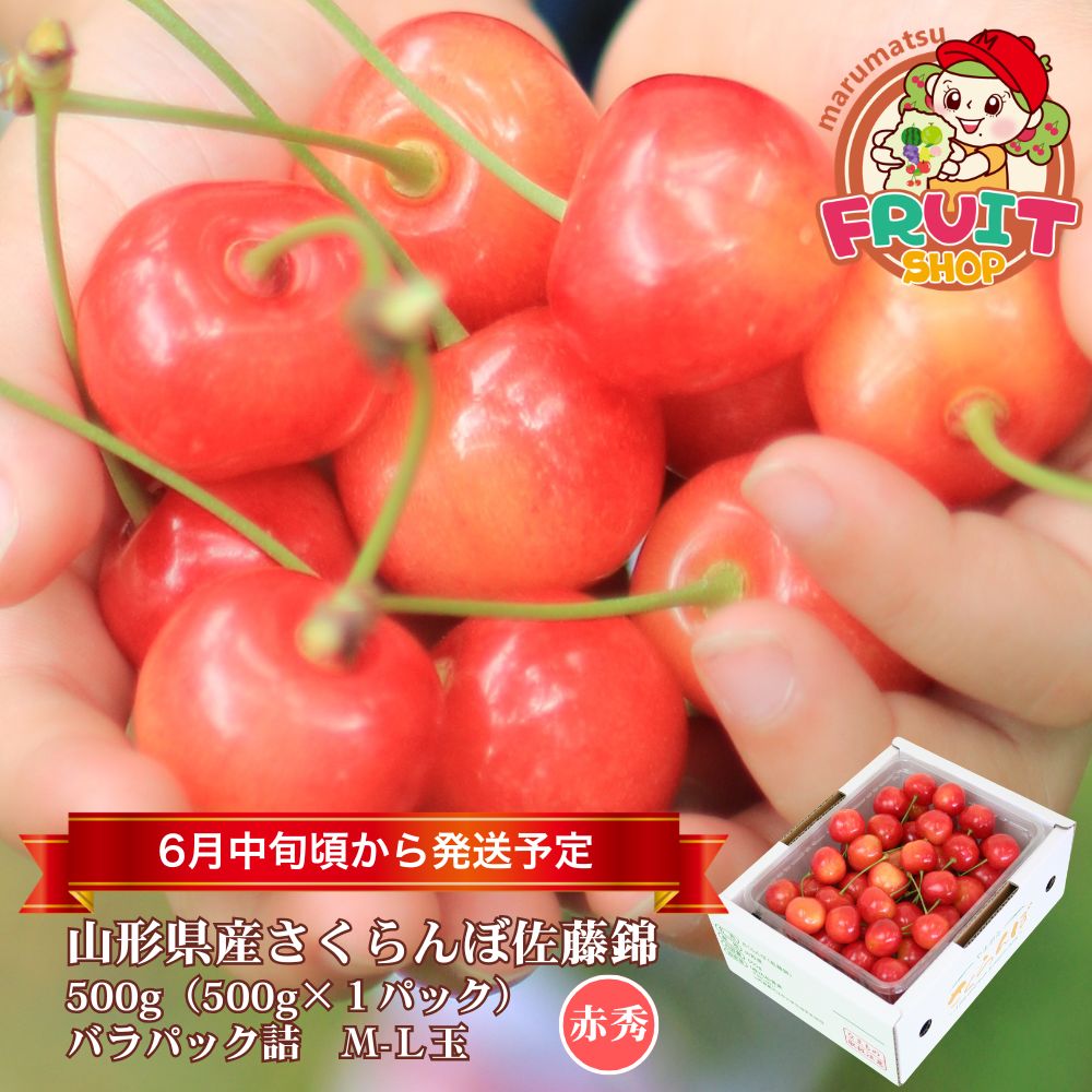 商品詳細 生産量日本一“山形県”名産のさくらんぼ佐藤錦です。人気の弾けるようなプリプリの粒は、甘さと酸味のバランスが良いのが特徴。当店ではL玉以上をギフト規格としておりますので、この規格はお手頃価格のご家庭用としてご紹介いたします! 産地 山形県 品種 山形県産さくらんぼ「佐藤錦」 内容量 赤秀品М- L玉 500g(500g×1P)バラ詰 送料 冷蔵便 送料無料(2箱まで1梱包) ※ただし沖縄・一部離島は受付不可 発送時期 6月中旬頃?6月末頃まで※天候によって時期がずれる場合がございます。 ※お届け日指定は承れせんのでご了承ください。※仕入の状況により、時期が前後することがございます。 ご注意 他の商品(他品種・他規格)との同梱はできません。※人気商品につきお届けまでお時間をいただく場合がございます。商品の性質上、 1日の出荷数量が限られているため、何卒、ご了承の上ご注文いただけますようお願い申し上げます。 お支払い クレジットカード、前払い決済・後払い決済。 出荷終了時期が差し迫っている商品の前払い決済はご注文をキャンセルさせていただく場合がございます。予めご了承ください。 商品サイズ 300×200×80(mm)