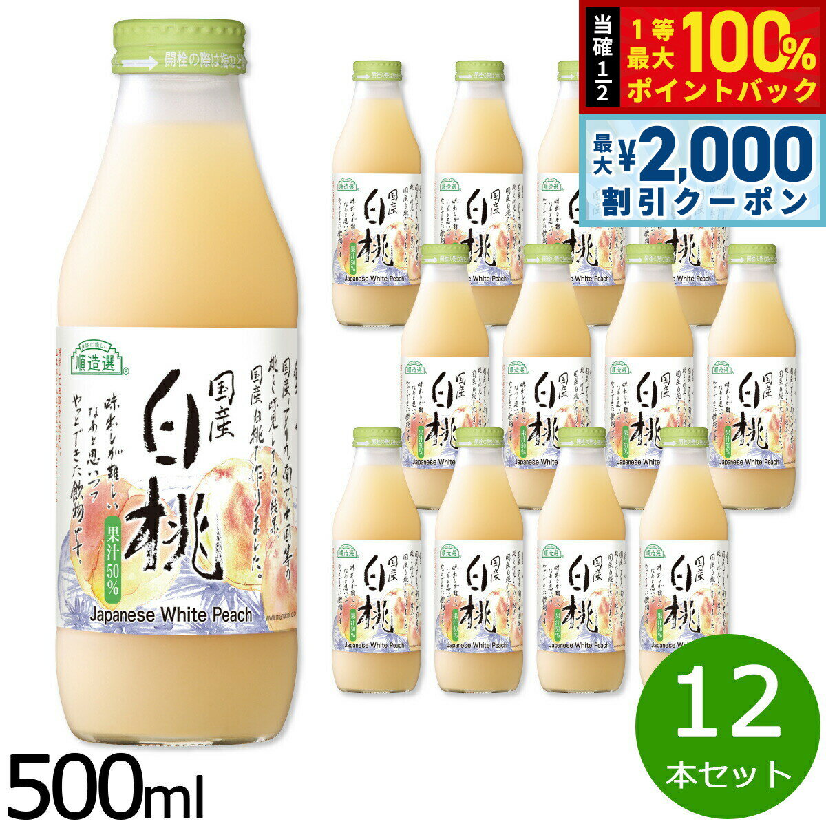 国産白桃だけに限定して濃厚に搾りました商品名順造選 国産白桃ブランド順造選名称50%もも果汁入り飲料原材料もも、砂糖、酸化防止剤(ビタミンC)栄養成分表示エネルギー54kcal、たんぱく質0g、脂質0g、炭水化物13g、食塩相当量0.0g、カリウム94mg/100mlあたり賞味期限12ヶ月保存方法直射日光を避け、常温で保存して下さい。開封後は要冷蔵。内容量500ml×12本セットカロリー54kcal/100mlあたり大きさW70mm×D70mm×H205mm生産国日本原産国日本本体重量9.12kgメーカー名マルカイコーポレーション株式会社製造所株式会社なかひら農場順造選 国産白桃国産白桃だけに限定して濃厚に搾りました
