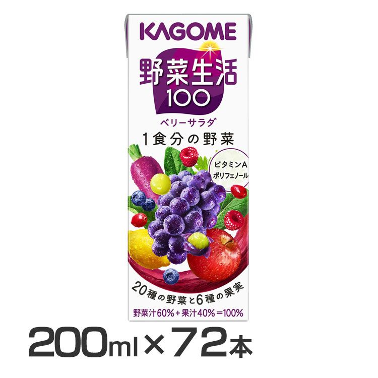 ※リニューアルに伴いパッケージ・内容等予告なく変更する場合がございます。予めご了承ください。「野菜生活100」ベリーサラダは20種類の野菜と6種類の果実を使用した野菜果実ミックスジュースです。ぶどうと3種類のベリーの芳醇な味わいを楽しみながら1食分の野菜とビタミンAとポリフェノールが摂れるので家族みんながおいしく手軽に野菜を補える野菜飲料です。●内容量200ml×72本●原材料野菜(にんじん、紫いも、紫キャベツ、赤じそ、はくさい、ブロッコリー、ケール、アスパラガス、メキャベツ(プチヴェール)、パセリ、セロリ、ほうれん草、レタス、かぼちゃ、クレソン、ビート、赤ピーマン、キャベツ、たまねぎ、だいこん)、果実(りんご、ぶどう、レモン、ブルーベリー、ラズベリー、クランベリー)/クエン酸、香料●栄養成分(200ml当たり)エネルギー:83kcal、 たんぱく質:0.7g、脂質:0g、炭水化物:20.3g、 ナトリウム:15〜84mg、 糖質:19.8g、糖類:17.5g、食物繊維:0〜1.0g、食塩相当量:0.03 〜0.3g、カリウム:390mg、カルシウム:11〜30mg、ビタミンA:160〜800μg、ビタミンK:0〜8μg、葉酸:1〜8μg、α−カロテン:420〜4200μg、β-カロテン:1800〜7500μg、ポリフェノール:54〜240mg ○広告文責:e-net shop株式会社(03-6706-4521)○メーカー(製造):カゴメ株式会社○区分:飲料(検索用:野菜ジュース 野菜生活 ミックスジュース 紫の野菜 ベリーサラダ 朝食 朝ごはん 親子 ポリフェノール ビタミンA 4901306175514) 最強翌日配送対象商品に関するご案内 最強翌日配送対象商品・対象地域に該当する場合は最強翌日配送マークがご注文カゴ近くに表示されます。 最強翌日配送可能なお支払方法は【クレジットカード、代金引換、全額ポイント支払い】のみとなります。 下記の場合は最強翌日配送対象外となります。 ・15点以上ご購入いただいた場合 ・時間指定がある場合 ・ご注文時備考欄にご記入がある場合 ・決済処理にお時間を頂戴する場合 ・郵便番号や住所に誤りがある場合 ・最強翌日配送対象外の商品とご一緒にご注文いただいた場合 ・お届け先住所文字数が40文字以上の場合