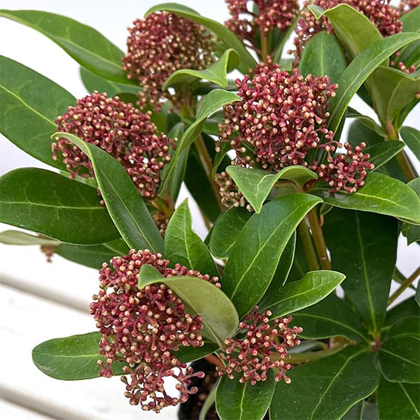 蕾が紅色になる選抜品種シリーズ ミヤマシキミ 蕾付 雄木花木 庭木の苗/スキミア:ルベスタ ジャイアントピンク4.5号ポット冬の鉢花として人気のスキミア!細かく美しい蕾がぎゅっと集まる姿が可憐です。蕾の状態で長く観賞でき、春に開花します。スキミアは日本のシキミにちなんだ名前で、ミヤマシキミの園芸品種、英名はスキミアと呼ばれています。日本原産のシキミがヨーロッパにわたり、欧米で人気となって改良種が多数生まれています。ルベスタ系は雄木で、蕾が紅色になる選抜園芸種。真紅の集合から白い花が次々に開き、コントラストが目にも鮮やかな品種です。蕾がつく時期がクリスマスにぴったりなことからこの名前があります。ルベスタ ジャイアントピンクはピンク色の蕾で他の品種よりもやや大きめの花を咲かせます。庭木、切花におすすめです。タイプ耐寒性常緑低木樹高60〜100cm鑑賞期10月〜5月日照日向〜半日陰むき栽培方法耐寒性・耐暑性があり、日向、半日陰とも大丈夫なので栽培はいたって容易です。秋または春に苗を植え付けてください。お届けする苗は4.5号(直径13.5cm)ポット入り、樹高約20〜30cm前後です。樹高は多少変動することがあります。お届け時期により開花が進んでいたり、開花が終了している場合があります。また冬季は寒さの影響で蕾の一部に傷みがある場合があります。写真は成長・開花時のイメージです。※品種登録または品種登録出願済みの品種ですので、無許諾で苗木等を増殖して販売することはできません。