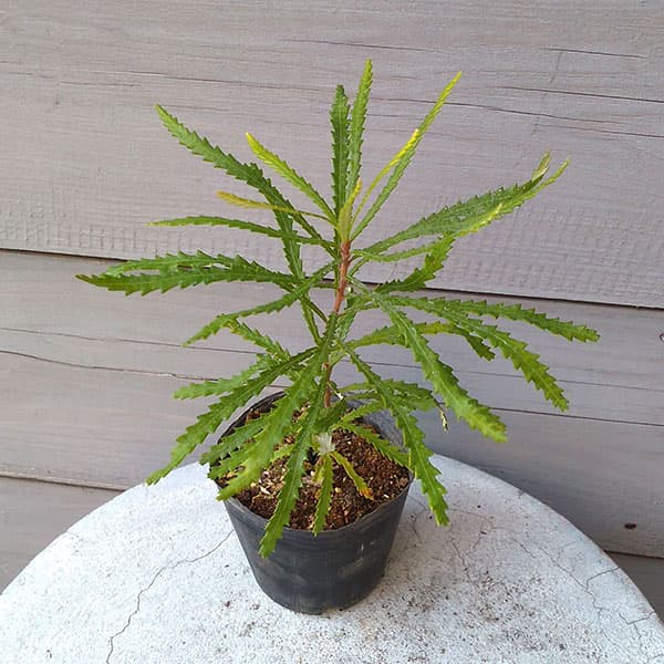 細い鋸葉で黄色の花を咲かせる常緑低木 オーストラリア花木花木 庭木の苗/バンクシア:スピヌローサ4号ポットバンクシア属は主にオーストラリアに分布する常緑中低木です。大きなコーンのような花の形に特徴があり、切花としても人気です。スピヌローサは、細長い鋸葉、花色は黄色。耐寒性は−5℃位です。タイプバンクシア属の半耐寒性常緑中低木耐寒性マイナス5度まで日照日向むき栽培方法:日当たりの良い場所で、排水の良い土を好みます。暑さには強いですが、夏場の高温多湿の環境には弱いので、蒸れには注意が必要です。夏場の雨の後に極端に晴れ、温度が上がった時のモワッとした環境では葉が萎れてしまうので、環境にはご注意ください。鉢植えの場合はストレスを避けるため、いきなり大きな鉢に植え替えるのは避け、6号か7号くらいのものに植え替えてください。耐寒性はやや弱いので庭植えは関東地方以南の太平洋側で。冬場は根元に腐葉土などでマルチングし、防寒してください。寒い地方では鉢植えにして冬季は室内にとりこんでください。肥料は控えめに与えます。4号(直径12cm)ポット入り、鉢下からの高さ約30cmでsy,」樹高は多少前後します。またお届け時期により葉がきれいでない状態の場合があります。写真はイメージです。