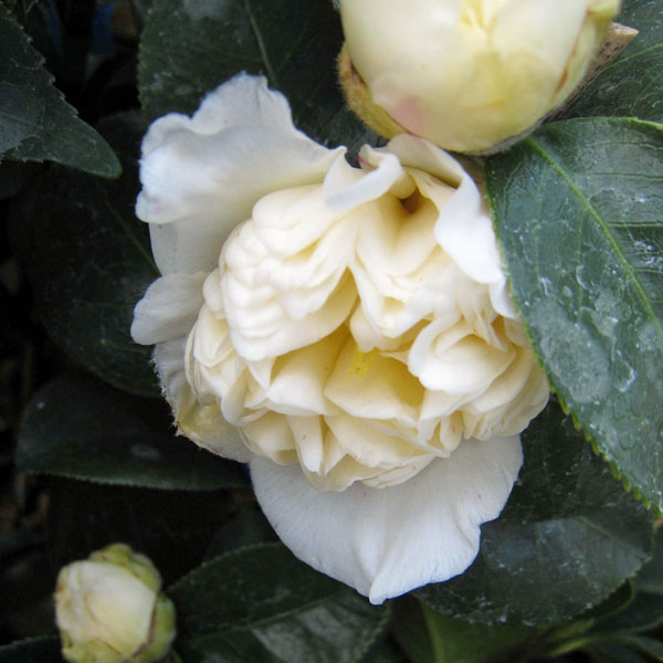 1月〜4月開花 玉の浦×岩根絞の交配種 くっきりとした白覆輪の紅花八重咲き花木 庭木の苗/ツバキ(椿):玉ありあけ4.5号ポット玉ありあけは玉の浦×岩根絞の交配種です。紅色の色鮮やかな花弁に深い白覆輪がくっきりと入る美しい八重咲きです。厳寒期に咲く花はやや紫を帯び印象的です。開花期間も長く、初心者にも育てやすい新種です。独特の趣を持つ椿は、古来庭植えや鉢植えのほか茶花としても愛好されてきました。水はけさえ良ければ育てやすい丈夫な花です。記念樹としても最適です。タイプ:ツバキ科ツバキ属の耐寒性常緑小高木樹高:2〜4m開花期:1〜4月花色:紅地に白の覆色咲き方:牡丹咲きから八重咲きへと変化する変わり咲き種植え付け適期:9〜11月、3〜4月栽培適地:東北地方以南日照:日向または半日陰(開花するようになると日向のほうが適しています)※花色・花形は栽培状況によって変化することがあります。栽培方法日当たり、水はけの良い場所を好みます。酸性土を好むので、植え付けの際に植え穴にピートモス、腐葉土またはブルーベリー栽培用土などを混ぜ込んでください。2〜3月に寒肥として、油粕や骨粉を根元に施します。剪定は花後すぐに行います。葉芽の先に花がつくので、葉芽を残すように間引き剪定をします。夏に花芽が分化するので、夏以降は枝を切らないようにしてください。ツバキには4月と7月頃にチャドクガが発生しやすいので、殺虫剤で駆除してください。4.5号(直径13.5cm)ポット入り、樹高約50cmです。写真は開花時のイメージです。