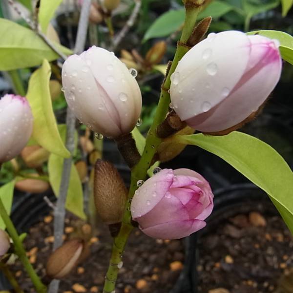 花木 庭木の苗/ミケリア:ミックスドアップミス6号ポット[茶色い蕾からピンクを帯びた芳香のある花 カラタネオガタマ]オガタマノキの仲間で、ヒマラヤ東部からチベット、中国南西部に自生しているミケリア・ドルツォパ(M.doltsopa)の園芸品種シルバー クラウド('Silver Cloud')とカラタネオガタマの交配種で、ニュージーランドで育成された比較的新しい園芸品種です。花の少ない3月頃にビロードに包まれたような茶色い蕾からピンク色を帯びた開ききらない微芳香の花を咲かせます。成長はゆっくりで、上に伸びるより株立ち状に幅が広がっていき、枝は節間が詰まってコンパクトにまとまります。鉢植えや小さなスペースでも育てられます。学名:Michelia‘Mixed up Miss'タイプ:モクレン科常緑低木栽培適地:関東地方以南(耐寒性−5℃程度まで)樹高:2.5m(7〜8年程度で)開花時期:3月頃日照:日向から半日陰栽培方法:日当たりの良い場所に植えつけますが、多少寒さに弱いので、寒冷地では鉢植えにします。冬に特に冷たい風にあたると葉が落ちる場合があります。露地植えの場合は冬の寒風を避けられる場所に植え付けてください。明るい半日陰でも花を楽しめます。植えつけは春から9月にかけてがよく、秋から冬は避けてください。土質は選びませんが、水はけのよい場所に植えつけます。剪定は基部から生じる徒長枝を間引く程度。移植はむずかしいので、庭植えの場合はよく場所を選んでください。病害虫はほとんど見られません。お届けする苗は6号ポット植え、樹高約30〜50cm前後です。樹高につきましては入荷時期により多少変動することがあります。写真は成長・開花時のイメージです。■この商品は第二配送センターよりお届けします。下記サービスについてはお受けできません。・メッセージカード・栽培ガイドの添付・ラッピング・代金引換決済・時間帯指定は地域によりご指定がお受けできない場合があります・配送業者の指定ミケリア:ミックスドアップミス6号ポット[茶色い蕾からピンクを帯びた芳香のある花 カラタネオガタマ]の栽培ガイドマグノリア(モクレン・コブシ・大山レンゲの仲間)