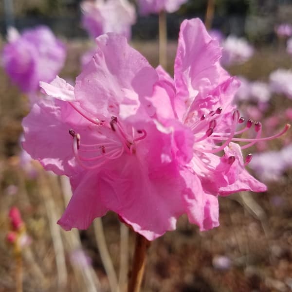 ゲンカイツツジ花木 庭木の苗/ツツジ:桜玄海ツツジ樹高40〜50cm根巻き玄海ツツジは枝先にロウト型の花を数輪ずつつける落葉性ツツジです。カラムラサキツツジの変種で、葉裏や枝に毛があるのが特徴。桜玄海ツツジは枝先に多数の澄んだピンク色の花を咲かせる早咲き種。樹勢強健で、暑さ寒さに強く、庭木に最適です。タイプ:ツツジ科の耐寒性落葉低木樹高:2〜4m開花期:4月栽培適地:東北地方以南栽培方法:日当たり、水はけのよい場所に腐葉土をたっぷり施して植えてください。やや盛り土気味に植え付け、根元はピートモスなどで覆って乾燥防止してください。剪定は可能ですが、自然樹形のままのほうがきれいにまとまります。花芽分化は7〜8月なので、この頃以降はなるべく枝を切らないようにしてください。肥料は、1〜3月に寒肥として根元に腐葉土などを施し、花後の5月、7月下旬から8月上旬、10月にそれぞれ追肥として緩効性化成肥料を施してください。高温や乾燥にやや弱いので、夏場に西日が強くあたる場所はさけてください。樹高は多少変動します。秋以降は一部落葉や葉がきれいでない状態の場合がございますので、ご了承ください。お届け後は根を乾かさないように管理し、なるべく早く植えつけてください。お届け時期により開花後となる場合がございます。写真は成長・開花時のイメージです。※落葉樹は秋から冬にかけてのお届けの場合、掘り上げに際して既存のついている葉が時間の経過とともに枯れてしまう状態となりますが、植え付け後の生育には支障ございません。葉が枯れている場合はそのままでも自然に落葉しますが、見栄えが良くないという場合は取り除いてください。※商品のお取り寄せに数日かかる場合があります。※本来は秋に落葉する品種ですが、苗木のうちは葉が少なく、昨今の猛暑の影響もあるため、初夏に葉焼けや斑点がある状態〜落葉した状態となります。お届け時に葉が無い場合があります。ツツジ:桜玄海ツツジ樹高40〜50cm根巻きの栽培ガイド花木・果樹の根巻き苗大型根巻き苗のお届け形態について