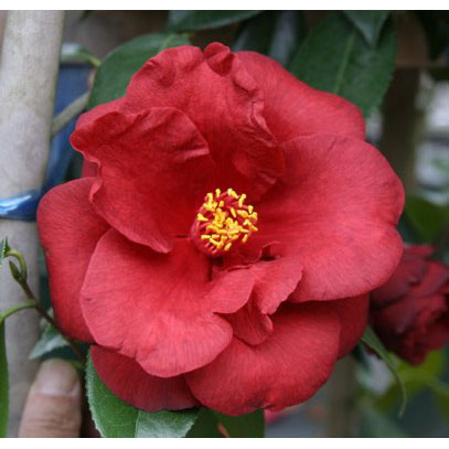 前田ナーセリー特選品種 3月〜5月開花 シルクのような質感の濃赤色の半八重咲き花木 庭木の苗/ツバキ(椿):ロイヤル・ベルベット4号ポット国内の古典品種から海外の希少種・最新品種まで、幅広く優れた椿の収集とオリジナル品種の育成を行う愛知県の「前田ナーセリー」の椿苗です。ロイヤル・ベルベット(Royal Velvet)はヤブツバキ系で暗紅色の半八重、蓮華咲きの大輪品種です。波打つ花弁がシルクのような質感の深い色合いで、美しい花です。アメリカ産。タイプ:ツバキ科ツバキ属の耐寒性常緑小高木樹高:2〜3m開花期:3〜5月植え付け適期:9〜10月、2〜4月栽培適地:東北地方以南日照:日向または半日陰(開花するようになると日向のほうが適しています)栽培方法日当たり、水はけの良い場所を好みます。酸性土を好むので、植え付けの際に植え穴にピートモス、腐葉土またはブルーベリー栽培用土などを混ぜ込んでください。2〜3月に寒肥として、油粕や骨粉を根元に施します。剪定は花後すぐに行います。葉芽の先に花がつくので、葉芽を残すように間引き剪定をします。夏に花芽が分化するので、夏以降は枝を切らないようにしてください。ツバキには4月と7月頃にチャドクガが発生しやすいので、殺虫剤で駆除してください。4号(直径12cm)ポット植え、樹高約40cmです。写真は成長・開花時のイメージです。