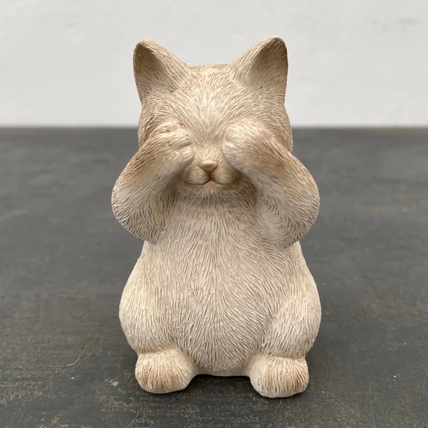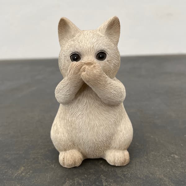 見ざる猫レジンアニマルキャットB アイボリー(HG02IV)ポリレジンの小さな子猫のオブジェ。「見ざる、聞かざる、言わざる」の「見ざる」のポーズです。サイズ幅7×奥行7×高さ12cm重量0.17kg 材質ポリレジンご注意:塗装は個体差があります。また小さなキズや変形がある場合があります。