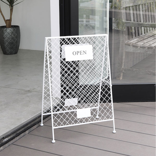 風で倒れにくいOpen・Closeボード 店舗用ホワイト・メッシュスモールボード(US-51)ショップのOpen・Closeボードの小型タイプ。オープン・クローズのプレート付きです。サロンやカフェ、ショップの入り口やエントランスにぴったりです。メッシュ構造で風に倒れにくく、軽量設計なので屋外使用や持ち運びも簡単です。下部のプレートに店舗名を入れたカッティングシートを貼り付けることで、オリジナリティもお楽しみ頂けます。 折り畳み式です。サイズ(約)幅30cm、奥行き23cm、高さ38.5cm、原産国中国材質スチール