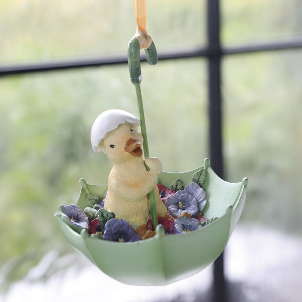 幅9.5cm 傘の中でちょこんとくつろぐヒヨコ・鳥アンブレラ・フロートチック(TW-15)傘の中でちょこんとくつろぐヒヨコのオブジェ。上部のリボンを吊るせば、まるで春の雨上がりのワンシーンのような可愛らしいディスプレイに。ヒヨコの頭についた殻や、小さなお花のあしらいが、ほんのり物語を感じさせます。窓辺や玄関、ちょっとしたスペースに吊り下げて、季節感あふれるインテリアを楽しんでみてはいかがでしょうか。サイズ(約)幅9.5cm、奥行き0cm、高さ12.5cm材質スチール、ポリレジン原産国中国※写真はイメージです。※植物、撮影資材などは含まれておりません。■商品のお取り寄せに数日かかる場合があります。※「メーカー欠品・入荷待ち」の場合があります。ご注文いただき欠品の場合はご相談をさせていただきます。ご了承いただきますようお願い致します。