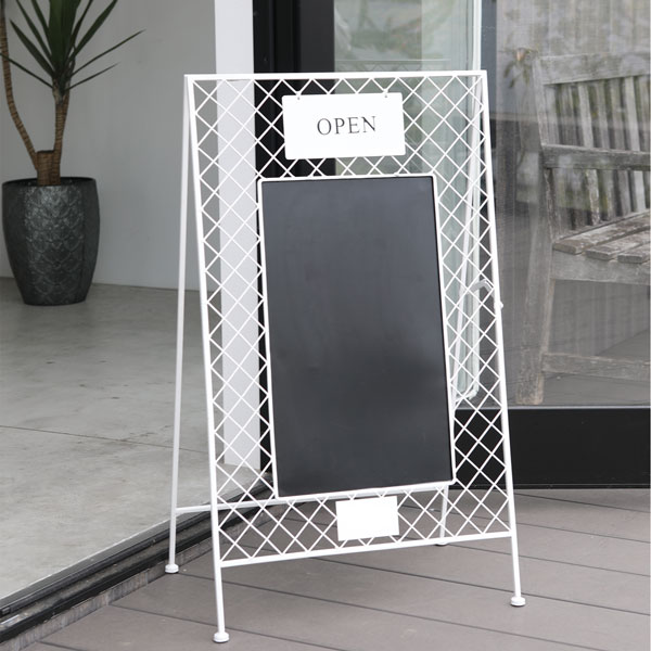 風で倒れにくい 店舗のお知らせにホワイト・メッシュサインボード(US-47)メッシュフレームとブラックボードが一体化したスタンドブラックボード。チョークでの書き込みや磁石での貼り付けが可能で、メニュー表やお知らせを貼り付けることができます。オープン・クローズのプレート付きで、サロンやカフェ、ショップの入り口やエントランスにぴったりです。メッシュ構造で風に倒れにくく、軽量設計なので屋外使用や持ち運びも簡単です。下部のプレートに店舗名を入れたカッティングシートを貼り付けることで、オリジナリティもお楽しみ頂けます。 サイズ(約):幅50cm、奥行き36.5cm、高さ85cm原産国:中国材質:スチール※写真はイメージです。※植物、撮影資材などは含まれておりません。■この商品はメーカー直送にてお届けのため、下記サービスについてはお受けできません。・日曜祝日指定・時間帯指定・メッセージカードの添付・代金引換決済■お届け地域について ・北海道、沖縄、離島へのお届けは、追加送料(実費)をいただきます。 ※メーカー直送品のため、タイミングにより欠品・入荷待ちとなる場合があります。ご注文前にお問い合わせいただけましたらご案内致します。欠品の場合はお届け時期等についてご相談をさせていただきます。