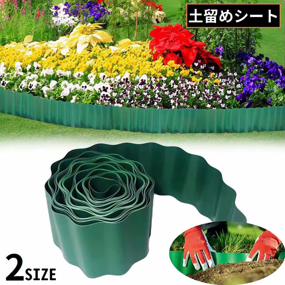 土の流失を防ぎ、根切り効果で雑草の侵入を防ぎます土留・根止めシートです。花壇づくりや芝生と植木の囲いに最適です。重い土袋を使わずにグルっと囲うだけで土留め作業ができ、見た目もスッキリします。囲える目安の広さ:約1.5坪柔らかく、自由に曲げられます。設置したい場所に溝を掘り埋め込んだ後に土を被せ、倒れない高さで固定・調節してください。はさみやカッターでカットも可能なので、好みのカタチの花壇をつくることができます。【サイズ】(約)高さ15cm×長さ9m地面に埋め込むだけでガーデニングスペースができあがり、湿気を吸収しないプラスチック製なので、 水ぶくれ / 剥離 / 腐食 / 腐敗などの心配はいりません。隙間を作らず、見た目もおしゃれ♪簡単に曲げることができるので、丸型やカーブなども思いのまま♪【こんな用途で】土 や 砂 の 流出防止 / 花壇づくり / 芝生 の 侵入防止 / 側溝 への土留め野菜 や 花 など 種類ごとの 間仕切り送料無料※北海道は+330円UP、離島地域及び沖縄県は+950円UPにて承ります