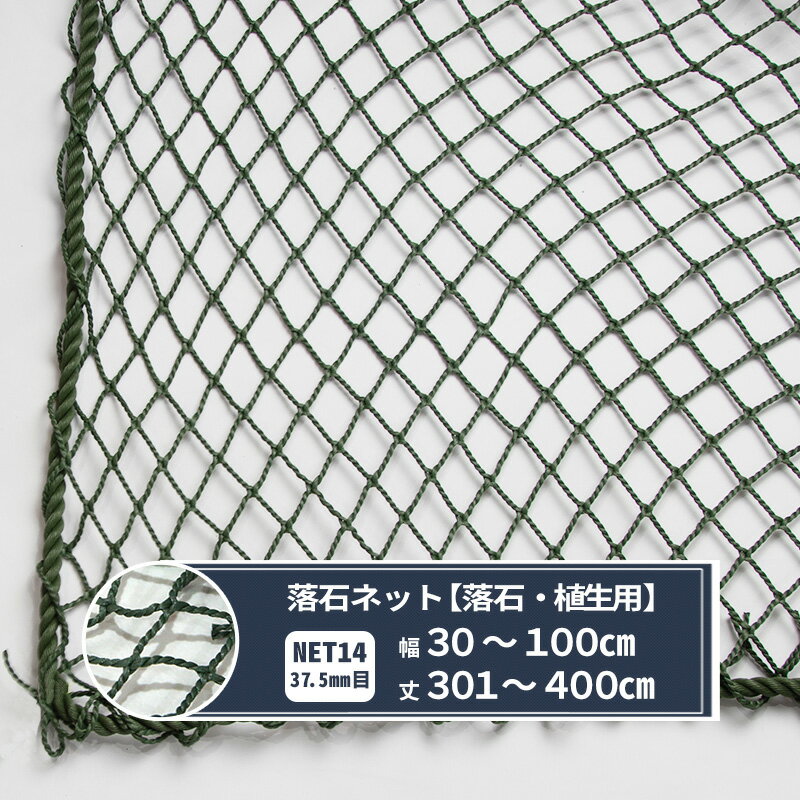 ネット 網 落石ネット 落石 植生 落石防止 ゴルフ場 芝押え オーダーサイズ 荷崩れ防止 荷物落下防止 軽量【NET14】落石ネット 落石・植生用 約9営業日後出荷 落石防止・ゴルフ場などの芝押えに! オーダーサイズ コンテナ荷などの荷崩れ防止、棚の側面に、四方を固定した状態に設置しての荷物落下防止などに最適。 合成繊維ネットのため、腐食及びサビの心配がありません。軽量なネットなので、運搬が容易になり、作業効率がUP! ゴルフ場などの芝押えにもご利用いただけます。 商品詳細 商品名 【NET14】落石ネット オーダーサイズ 網目 [タイプ]菱目 [大きさ]37.5mm目 [結節]無結節 糸 [規格]440T(400D)/120本 [太さ]4mmΦ [材質]ポリエチレン 重量 311g/m2 カラー ワサビ 周囲仕上げ 12φポリエチレンロープ(ダークグリーン)通し加工 納期 約9営業日後出荷 摘要 ・ファスナーオプション加工はできない商品です。ご了承ください。 ・ご注文確定後9営業日後の出荷です。(お振込みの場合は入金確認後、所定の納期がかかります) ・ネットの製品特性上、指定サイズから多少の誤差が発生いたします。 また、同じサイズを複数枚ご注文いただいた場合でも網目の関係上、多少サイズが異なる場合がございますのであらかじめご了承ください。 ・オーダーサイズのためご注文後の返品・交換・キャンセルのできない商品です。 ・出荷後の住所・送付先の変更は転送料が必要となりますので、ご注文前にお届け先住所を必ずご確認ください。 ・サイズは幅・丈とも1cm単位より指定できますが、網目に依存するので少し大きめに仕上がります。 ・ご注文の前に当店のご注文規定を必ずご確認ください。ご注文の際は、こちらのページの内容をご理解いただいたものと判断させていただきます。
