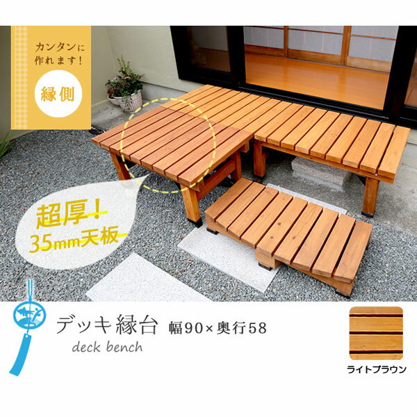 90×58×高さ40cm[送料無料]デッキ縁台:小90cm×58cmライトブラウン濡れ縁をイメージしたデッキ縁台シリーズ。お庭からお部屋への上がり端に設置すれば便利な濡れ縁のように利用できます。別売のデッキステップ、デッキ縁台プランターと組み合わせて花を飾れば憩いの空間に。サイズは幅90cm、奥行き58cmです。サイズ:幅90cm、奥行き58cm、高さ40cm重量:約12kg素材:杉(天然木)色:ライトブラウン(オイルステイン塗装)組立て式■お届け地域について ・北海道、沖縄、離島へのお届けは、追加送料(実費)をいただきます。ご注文/お問い合わせをいただきましてからお見積りしますので、ご了承ください。 ■メーカー直送品のため、下記サービスはお受けできません。・お届け時間帯指定(午前・午後のご希望は承りますが、状況によりずれる場合があります。夜間指定はできません)・一部の郡部での日曜・祝日指定・メッセージカードの添付・代金引換決済※写真はイメージです。