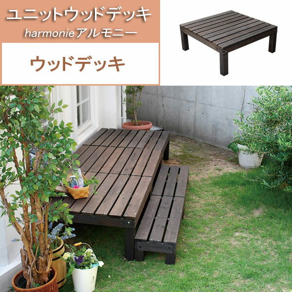 幅90cm奥行き90cm[送料無料]ユニットウッドデッキ harmonie(アルモニー) 90×90お庭にくつろぎのスペースを。何台でも組み合わせて、お気に入りのカタチに。縁台として、ウッドデッキとして、また飾り棚としてもお楽しみいただける、ユニットウッドデッキシリーズ「harmonie(アルモニー)」。90×90cmのウッドデッキとステップの組み合わせで、デザインは無限大!お庭に、ベランダに、お好きな場所&お好きなサイズで設置していただけます。 ※お届けは90cm×90cmのウッドデッキ1点です。サイズ(約):幅90cm、奥行き90cm、高さ36.5cm重量:約7.8kg材質:杉材天然木仕上げ:ステイン塗装色:ダークブラウン組み立て式生産国:中国※汚れたら水拭きしていただけます。天然木のため、色褪せやひび割れが発生する場合があります。ホームセンターで販売されている木材の保護塗料で塗り直しいただくなど、定期的なメンテナンスをおすすめいたします。ステイン塗料につきましては、衣料品等に色移りする場合がございます。乾拭きなどしてご利用ください。■お届け地域について ・北海道、沖縄、離島へのお届けは、追加送料(実費)をいただきます。ご注文/お問い合わせをいただきましてからお見積りしますので、ご了承ください。 ■メーカー直送品のため、下記サービスはお受けできません。・お届け時間帯指定(午前・午後のご希望は承りますが、状況によりずれる場合があります。夜間指定はできません)・一部の郡部での日曜・祝日指定・メッセージカードの添付・代金引換決済※写真はイメージです。