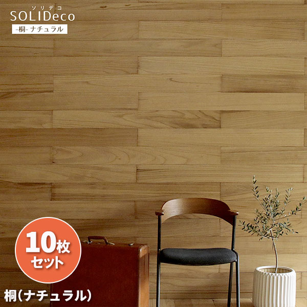 SOLIDECO ナチュラルシリーズ[送料無料]ソリデコ:壁に貼れる天然木パネル「桐」10枚組(約1.5平米分)シールタイプの天然木パネル「ソリデコ」。シールをはがしてペタッと貼るだけで、見慣れた壁がカフェ風に!本物の木を使用しているので、リアルでおしゃれな質感です。ウォールステッカーのような手軽さでお使いいただけます。お部屋がグッとおしゃれになりますよ♪カラーナチュラルシリーズ・桐サイズ(約)本体/幅 118cm、奥行き4cm、高さ12.8cm(1枚)重量約300g(1枚)材質天然木(桐)仕上げステイン塗装(クリア)・フラット組立区分完成品※ご注意天然木ならではの節や穴、ヒビ等がありますが不良品ではありません。また、製造工程上、裏面に塗料が付いている場合がありますが使用に差支えはありません。※施工上のご注意屋内専用です。屋外ではご使用いただけません。大きな凹凸のある場所や漆喰・砂壁・土壁等のザラザラしたところはお避け下さい。コンロや暖炉等の火まわりやシンク・風呂等の水気の多い場所ではお使いにならないでください。下地の環境によりうまく接着できない場合があります。予め作業前に目立たない場所で試し貼りをしてください。場合によっては接着剤との併用をおすすめします。通常の壁紙の上に貼った場合、剥がす際に壁紙も一緒に剥がれる恐れがあります。当製品はサーモ処理を施すことで無垢材の特徴である伸縮やねじれは通常の無垢と比較し軽減されていますが、完全に伸縮・ねじれが発生しないわけではありません。予めご了承ください。※写真はイメージです。お使いのブラウザにより現物と若干色が異なって表示されることがあります。■お届け地域について ・北海道、沖縄、離島へのお届けは、追加送料(実費)をいただきます。ご注文/お問い合わせをいただきましてからお見積りしますので、ご了承ください。 ■メーカー直送品のため、下記サービスはお受けできません。・お届け時間帯指定(午前・午後のご希望は承りますが、状況によりずれる場合があります。夜間指定はできません)・一部の郡部での日曜・祝日指定・メッセージカードの添付・代金引換決済★お届けする商品は「桐(ナチュラル)」です★