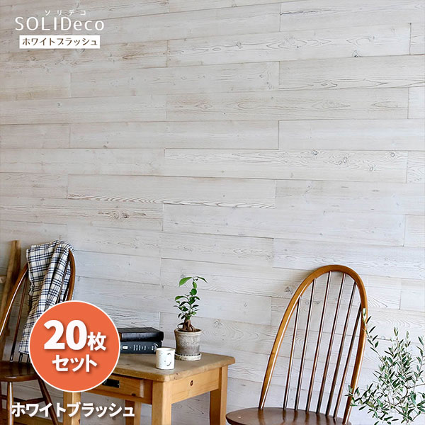 SOLIDECO ナチュラルシリーズソリデコ:壁に貼れる天然木パネル「ホワイトブラッシュ」20枚組(約3平米分)シールタイプの天然木パネル「ソリデコ」。シールをはがしてペタッと貼るだけで、見慣れた壁がカフェ風に!本物の木を使用しているので、リアルでおしゃれな質感です。ウォールステッカーのような手軽さでお使いいただけます。お部屋がグッとおしゃれになりますよ♪カラーナチュラルシリーズ・ホワイトブラッシュサイズ(約)本体/幅 118cm、奥行き4cm、高さ12.8cm(1枚)重量約300g(1枚)材質天然木(パイン)仕上げステイン塗装(クリア)・浮造り+目だし組立区分完成品※ご注意天然木ならではの節や穴、ヒビ等がありますが不良品ではありません。また、製造工程上、裏面に塗料が付いている場合がありますが使用に差支えはありません。※施工上のご注意屋内専用です。屋外ではご使用いただけません。大きな凹凸のある場所や漆喰・砂壁・土壁等のザラザラしたところはお避け下さい。コンロや暖炉等の火まわりやシンク・風呂等の水気の多い場所ではお使いにならないでください。下地の環境によりうまく接着できない場合があります。予め作業前に目立たない場所で試し貼りをしてください。場合によっては接着剤との併用をおすすめします。通常の壁紙の上に貼った場合、剥がす際に壁紙も一緒に剥がれる恐れがあります。当製品はサーモ処理を施すことで無垢材の特徴である伸縮やねじれは通常の無垢と比較し軽減されていますが、完全に伸縮・ねじれが発生しないわけではありません。予めご了承ください。※写真はイメージです。お使いのブラウザにより現物と若干色が異なって表示されることがあります。★お届けする商品は「ホワイトブラッシュ」です★