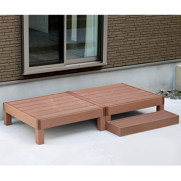 [送料無料]人工木ウッドデッキ ecofeel(エコフィール) 2台 ステップセット ダークブラウン(PWDE-2P-STP-DBR)お庭に癒しの景色をインストール。メンテナンス重視なら、人工木がおすすめ!家全体の雰囲気を一気に華やかに格上げする、ウッドデッキの圧倒的実力!90×90cmのウッドデッキとステップ、フェンスの組み合わせで、お好きなデザイン&サイズで設置していただけます。人工木なら、天然木のおしゃれな見た目はそのままに、腐食や虫害の心配もなく、丈夫で長持ち。お手入れがしやすく、色褪せも最小限です。ささくれや節が出ないのも安心ですね。1台の大きさは、90×90cmの正方形で、四方 から座ることができます。重量感があるので、大人が座っても、反対側が浮き上がったりしません。 子供なら3〜4人座って、かき氷を食べたりできそうですネ♪・商品名人工木ウッドデッキ ecofeel(エコフィール)2台 ステップセット・カラー・型番ダークブラウン…PWDE-2P-STP-DBR・サイズ縁台: 幅 約900×奥行 約900×高さ 約280mm(1台)ステップ 幅 約900×奥行 約280×高さ 約105mm・重量縁台:約21.2kg(1台)ステップ約8.4kg・材質木粉・ポリエチレン・組立区分縁台:組み立て式ステップ完成品・組立目安時間縁台:2人で20分(1台)・備考※人工木は高い強度がありますが、鋭利なものなどで強い衝撃を与えると、割れやへこみが生じることがありますのでご注意ください。また、高温になる場所で伸縮や反りなどの発生、その他紫外線や風雨・経年劣化による多少の色褪せが見られる場合があります。※入荷時期により、商品のデザイン・仕様が品質に差し支えない程度に予告なく変更される場合がございます。また、生産ロットによって、若干の色のばらつきが生じる場合がございます。大きなデザインの変更はございませんが、ご注意ください。※写真はイメージです。■お届け地域について ・北海道、沖縄、離島へのお届けは、追加送料(実費)をいただきます。ご注文/お問い合わせをいただきましてからお見積りしますので、ご了承ください。 ■メーカー直送品のため、下記サービスはお受けできません。・お届け時間帯指定(午前・午後のご希望は承りますが、状況によりずれる場合があります。夜間指定はできません)・一部の郡部での日曜・祝日指定・メッセージカードの添付・代金引換決済