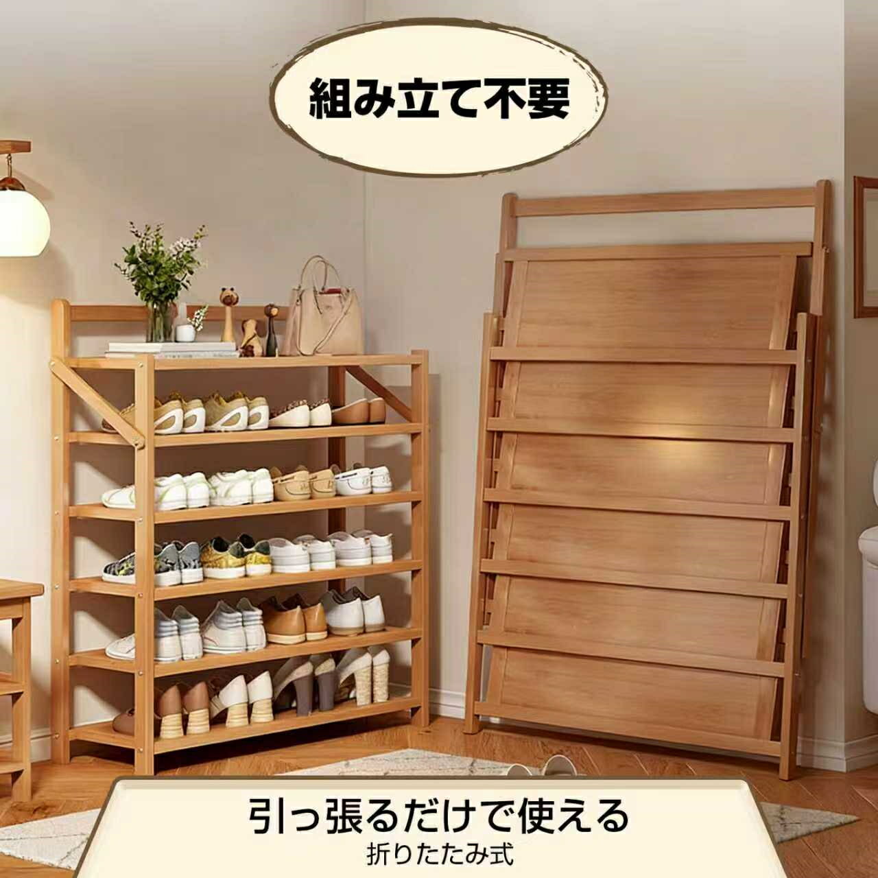 【商品仕様】 タイプ:折りたたみ可能なシューズラック 素材:楠竹 サイズ:表記サイズ(2?6段) 【注意事項】 特徴: 組み立て不要なシューズラックで、引っ張るだけですぐに使用可能。非常に便利で、スペースを取らず、折りたたんで収納可能。持ち運びが容易で、移動も簡単です。 カラーオプション: 様々なカラーオプションがあり、茶色、木の色、ブラック、ピンク、ホワイト、ライトグレーからお選びいただけます。 使用シーン: 玄関の整理整頓に最適で、靴をしっかり整理して収納できます。大人数の家族にお勧めします。 便利な機能:折りたたみ可能で、引っ越しや移動の際に3秒で折りたたんで運べます。女性でも簡単に持ち運べます。家族全員の靴を安心して収納できます。カードスロットの設計により、丈夫で安定感抜群。 デザインと使い勝手: 防塵防湿特徴があり、水の浸透を防ぎ、しっかりとした撥水性があります。掃除も簡単で、拭くだけで清潔に保てます。 サイズオプション: 2層、3層、4層、5層、6層といった様々なサイズオプションがあります。 品質と認証: BSCI認証とFSC認証を取得し、安定した品質で安心してお使いいただけます。 幅広い利用範囲: 家庭内の玄関や塾、サロン、クリニックのシューズ収納としてもお使いいただけます。 【注意事項】 ▼商品は簡易包装でお送り致します。 ▼お使いのモニターによっては、実際の色と若干異なって見える場合があります。 ▼ 製造時期によりデザインや仕様に若干の変更がある場合がございます。ご了承ください。 ▼実寸は素人採寸ですので、多少の誤差はご了承願います。 ▼在庫数の更新は随時行っておりますが、お買い上げいただいた商品が、品切れになってしまうこともございます。 その場合、お客様には必ず連絡をいたしますが、万が一入荷予定がない場合は、キャンセルさせていただく場合もございますことをあらかじめご了承ください。 【120日間保証】 ご使用中においてのお客様の過失による故障、破損、改造等はサポート保証の対象外となります 【返品・交換について】 ◆返品・交換の場合、未使用の商品のみ到着日から7日以内にご連絡頂ければ、対応させて頂きます。万が一お届け商品がご注文内容と異なったり、欠陥、汚損があった場合、交換、もしくは返金させて頂きます。