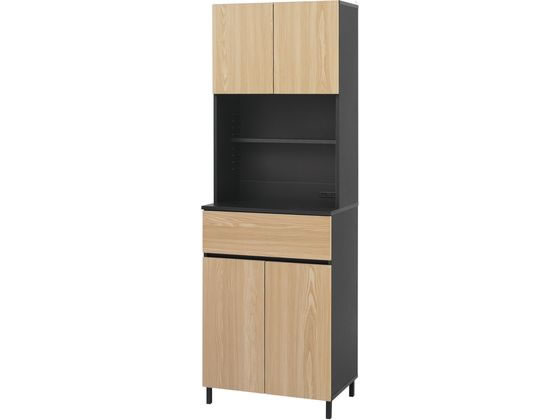 【商品説明】幅約60cm、奥行き約40cmの省スペースに設計。【本体上部】扉内は収納物に合わせた高さ調整が可能※本体下部も同様。オープンスペースは浅めの可動棚になっています。2口コンセント付き。【本体下部】下天板は熱、水、傷に強いメラミン樹脂を使用しています。引き出し収納は深型で、カトラリーや小物類の収納に便利です。【仕様】●「住環境に合わせた商品サイズの適正化」×「機能(伸長・収納)」×「質感・デザイン」にこだわったLDKシリーズ●商品サイズ(約)本体外寸:幅約595×奥行約398×高さ約1767mm●耐荷重(約):全体69kg、本体上部:天板5kg、固定棚板5kg、可動棚板(小)2kg、可動棚板(大)1枚あたり5kg、本体下部:天板20kg、引き出し3kg、可動棚板1枚あたり7kg、底板10kg■本体上部○扉内収納内寸(約):559×260×359mm○オープンスペース内寸(約):559×248×499mm○扉内収納の棚:可動棚板2枚、約32mm間隔で5段階可動○オープンスペースの棚:可動棚板1枚、約32mm間隔で9段階可動○定格電圧:AC100V○定格周波数:50Hz/60Hz○消費電力合計:1500Wまで■本体下部○引き出し内寸(約):510×336×96mm○扉内収納内寸(約):559×364×532mm○扉内収納の棚:可動棚板2枚、約32mm間隔で10段階可動●可動スチール脚の高さ(約):83mm●注文単位:1台【備考】※メーカーの都合により、パッケージ・仕様等は予告なく変更になる場合がございます。【検索用キーワード】irisohyama アイリスオーヤマ あいりすおーやま アイリス あいりす キッチンキャビネット ナチュラル ブラック キッチンキャビネット ナチュラル ブラック きっちんきゃびねっと なちゅらる ぶらっく キッチンキャビネット キャビネット きゃびねっと 収納 W595×D398×H1767mm 台 食器 キッチン用品収納 キッチン 木目 炊飯器 KCB−590H 厨房用品 ワゴン・棚・収納 str_02 R8557Dライフスタイルに合わせてお好みのボードが選べる、キッチンキャビネットです。