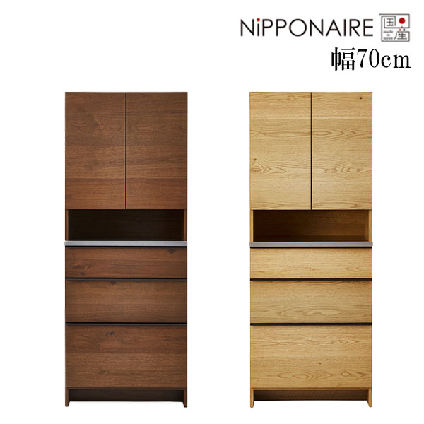 商品説明 サイズ(cm) W70×D48×H180 カラー WN(ウォールナット節有) OAK(オーク節有) 仕様 □材質 [WN] 前板:ウォールナット節有突板 側面:WN色プリント [OAK] 前板:ホワイトオーク節有突板 側面:OAK色プリント [共通] カウンター天板:ステンレス 取っ手:アルミ製 □仕様 ・オイル塗装 ・上台の開き扉:耐震ラッチ付き、棚板2枚付き(60mmピッチ・7段階調整) ・引出し:Hettich社(ドイツ)のソフトクローズレール使用 送料 送料無料 ただし、北海道、沖縄、離島は追加料金がかかります。お気軽にお問合せ下さい。.