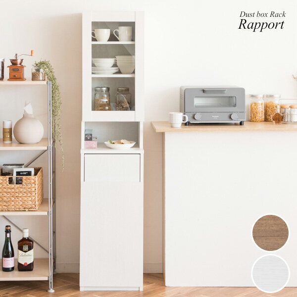 商品説明 サイズ(cm) 幅35×奥行き40×高さ160 カラー BR(ブラウン)/WH(ホワイト) 仕様 ■材質 合成樹脂化粧繊維板 プリント紙化粧繊維板 ガラス スチール ■備考 組立式(約60分) 対応ポリ袋:45L 耐荷重:棚各3kg、天板5kg 送料 送料無料 ただし、北海道、沖縄、離島は追加料金がかかります。お気軽にお問合せ下さい 食器や雑貨が収納できるガラス扉のラックと、プッシュ式のゴミ箱が一つになったダストボックスラック『Rapport(ラポール)』。 ゴミ箱に見えないスタイリッシュなデザインがお部屋に馴染み、スリムで場所を取らない省スペース設計は家具や家電のすき間に置けます。 容量45Lでキッチンやリビング、寝室など収納が必要でゴミが出る場所にピッタリ。ニオイが漏れにくく押すだけで簡単に捨てられるプッシュ扉式。ゴミ袋の着脱も簡単な前扉があり、利便性もバツグンです。 カラーはブラウンとホワイトの2カラーをご用意。お好みやお部屋の雰囲気でお選びいただけます。