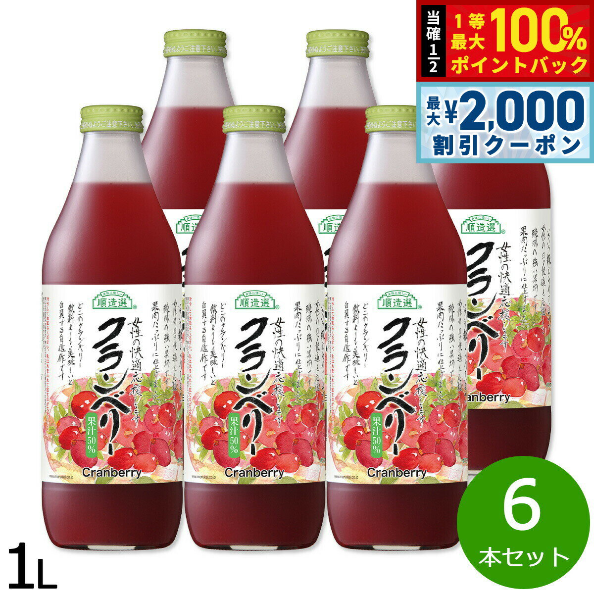 マルカイ 順造選 クランベリー 1000ml×6本【送料無料】 自然のままの味わいのクランベリージュース。アントシアニンなどのポリフェノールを豊富に含み、女性に人気のクランベリー果汁飲料です。 発売元:マルカイコーポレーション 内容量:1000ml×6本 素材にこだわった、カラダに優しいクランベリージュース。 「マルカイ 順造選 クランベリー 1000ml×6本」は、クランベリーの果実を果肉ごと使用したクランベリージュースです。(果汁含有量50%) クランベリーには、アントシアニンやプロアントシアニジンというポリフェノールが豊富に含まれており、特に女性の健康に良い果実として知られています。クランベリーは北米などの寒冷地に分布するツルコケモモ科の果樹で、アメリカ先住民の間では古くから健康に良いハーブとして利用されてきました。現在でも、アメリカではジャムやお菓子、ジュースなどポピュラーに利用されています。 「マルカイ 順造選 クランベリー 1000ml×6本」は、独特の甘酸っぱさのあるクランベリーに砂糖を加え、飲みやすく仕上げたクランベリージュースです。特に女性の健康サポートなどにおすすめいたします。毎日の健康飲料として、「マルカイ 順造選 クランベリー 1000ml×6本」をご利用ください。 原材料 クランベリー、砂糖 栄養成分表 100gあたり エネルギー 56kcal 広告文責:いいもの健康有限会社 電話番号: 042-498-2113 ◆◇◆ レビューでクーポンキャンペーン実施中!! ◆◇◆ レビューを書いて、次回使える10%OFFクーポンがもらえるキャンペーンを実施中です。 1. 商品到着後、楽天市場にログインし、注文履歴よりレビューを投稿してください。 2. 10%OFFクーポンがメールで届きます。 3. メール内のクーポンURLをクリックすると、10%OFFクーポンがGETできます。 (注1) クーポンの利用期限は約60日となります。 (注2) クーポンのご利用回数は1回。当月内のクーポン発行は1回までとなります。(毎月新規クーポンを発行しております。) レビューの書き方はこちら。