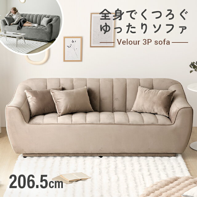 サイズ(約) 全長:幅206.5×奥行き86×高さ78.5cm 座面高:45.5cm 材質 構造部材:木枠/Sバネ/ゴムバンド/ウレタン 張地:ファブリック(ベロア生地) 重量(約) 52kg 耐荷重(約) 250kg 付属品 クッション×3 原産国 ベトナム 製品保証 1年間保証 ご購入前の注意事項 ・モニターにより実際の色と異なる場合がございます ・デザインや仕様は予告なく変更する場合がございます 送料 無料 北海道札幌市のみ:+7,000円 北海道札幌市以外:+14,000円 東北:+5,000円 沖縄・離島:お見積り ALL IN ONE デリバリーサービス こちらのサービス料は商品代金に含まれています ALL IN ONE デリバリーサービスについて 追加料金 ・別途送料がかかる地域の方 ・追加料金オプションを選択された方 ご注文時には追加料金が反映されません 「ご注文確定メール」にて改めてご案内いたします 配送 ・ALL IN ONE デリバリーサービスでお届けいたします ・代金引換不可の商品です ・大型特別配送の商品です ・出荷後のキャンセルや変更は別途送料が発生します 下記ページをご確認の上、ご購入ください 商品の配送について 「ご注文確定メール」にて改めてご案内いたします 梱包 サイズ:205×88×83cm(56kg)