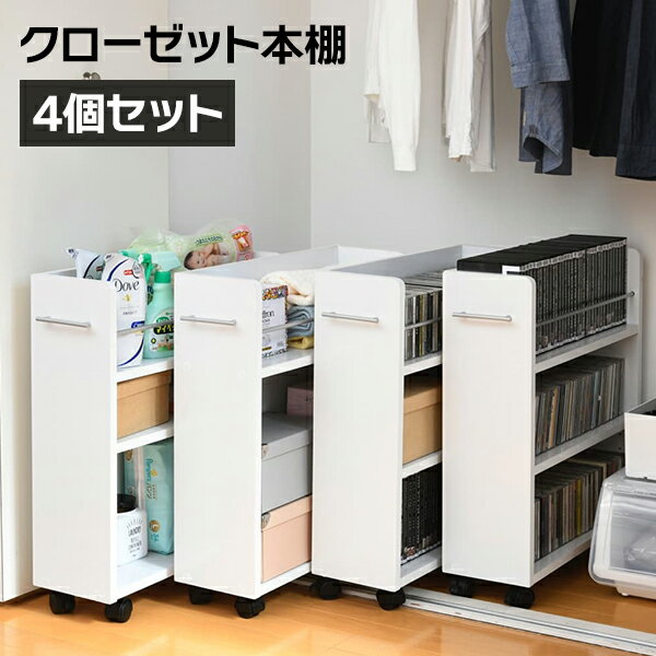 キャスター付きの便利なクローゼットラック4個組。取っ手はどちらにも取り付け可能なので、収納箇所の向きは左右入れ替えできます。本やメディア類や、日用品のストックまで、クローゼット内のスペースを有効活用するのでお部屋をすっきり片付けられます。クローゼット収納ラック 本棚 4個セット 幅19 奥行58 キャスター付きワゴンをDCMでは販売しております。その他の家具・収納用品も多数取扱っております。 [外寸](1個あたり)幅19.5×奥行58.5×高さ65.5cm[内寸](オープン部)幅52×奥行17.5×高さ39cm/(上部オープン部)幅52×奥行15×高さ16.5cm こちらの商品はお客様組立品になります。商品は、画像と現物とでは色が異なって見える場合がございます。↓↓↓ 色違いはこちら ↓↓↓ ナチュラルはこちら ダークブラウンはこちら