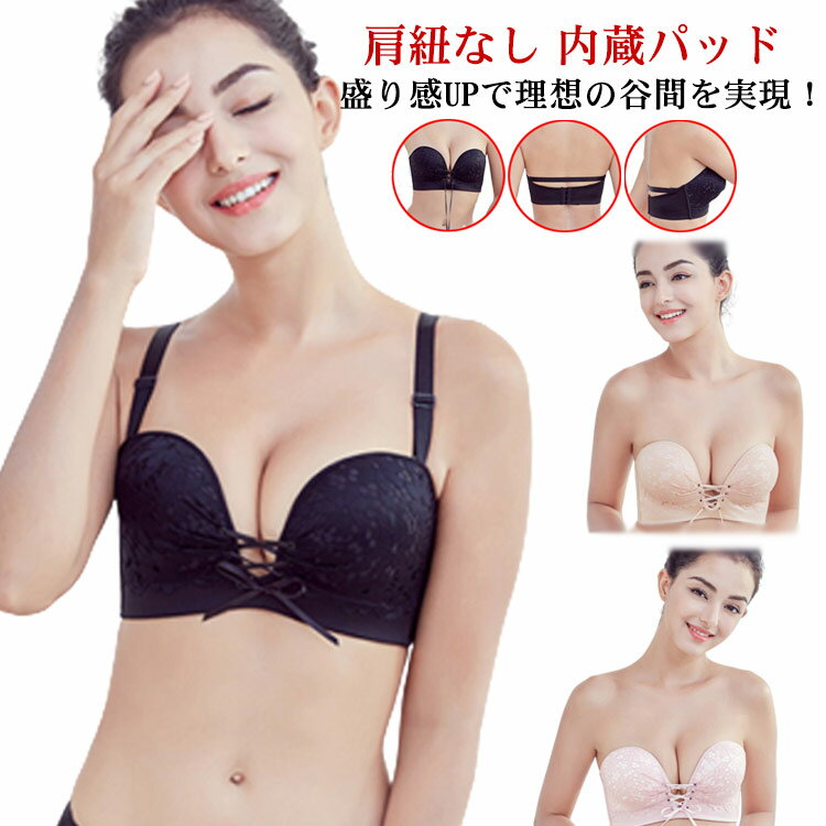 盛り感UPで理想の谷間を実現!「ストラップレスブラジャー」これ1枚で全て解決します。ブラジャーの肩紐を気にすることなく、おしゃれなファッションを楽しめます。 約3cmの極厚内蔵パットがふかふかで着け心地快適!センターリボンを絞って谷間ボリューム感アップ!バックストラップ付きでずれ落ち防止。付属のストラップは洋服に合わあせて付け替え可能 。 サイズ 70AB 75AB 80AB 85AB サイズについての説明 70AB 75AB 80AB 85AB 素材 色 ピンク ブラック 肌色 備考 ●サイズ詳細等の測り方はスタッフ間で統一、徹底はしておりますが、実寸は商品によって若干の誤差(1cm?3cm )がある場合がございますので、予めご了承ください。 ●製造ロットにより、細部形状の違いや、同色でも色味に多少の誤差が生じます。 ●パッケージは改良のため予告なく仕様を変更する場合があります。 ▼商品の色は、撮影時の光や、お客様のモニターの色具合などにより、実際の商品と異なる場合がございます。あらかじめ、ご了承ください。 ▼生地の特性上、やや匂いが強く感じられるものもございます。数日のご使用や陰干しなどで気になる匂いはほとんど感じられなくなります。 ▼同じ商品でも生産時期により形やサイズ、カラーに多少の誤差が生じる場合もございます。 ▼他店舗でも在庫を共有して販売をしている為、受注後欠品となる場合もございます。予め、ご了承お願い申し上げます。 ▼出荷前に全て検品を行っておりますが、万が一商品に不具合があった場合は、お問い合わせフォームまたはメールよりご連絡頂けます様お願い申し上げます。速やかに対応致しますのでご安心ください。