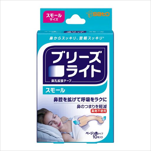 【商品名】 ブリーズライト エクストラ クリア(透明タイプ) レギュラーサイズ 【製造販売会社】 佐藤製薬(サトウ製薬/sato) 【ご使用について】 【使用方法】 ・鼻骨の下を親指と人差し指で両側からつかんで呼吸のできなくなるところが最適な位置です。 (1)鼻をよく洗って乾燥させます。 (2)中央を鼻の中心に合わせ、両側を見つけた位置に合わせます。 (3)両側を鼻にそって曲げて、指でさすってしっかりと接着させます。 ・はがすときは、ブリーズライトをぬるま湯でよくぬらして、まず四すみをはがし、両側から少しずつゆっくりと引き上げてはがします。 【使用上の注意】 ・使用に際しては、添付の説明書をよく読んでください。 ・本品は、鼻腔を拡げるため鼻の表面に装着するテープです。本来の目的以外には使用しないでください。 ・5歳未満のお子様には使用しないでください。 ・キズ、湿疹、日焼け、かさつきなど皮膚に異常がある場合は使用しないでください。 ・本品の使用によって睡眠時無呼吸症候群が緩和されることはありません。 ・昼夜を問わずに使用できますが、1日に12時間以上続けて使用しないでください。発疹、かぶれの原因になることがあります。 ・本品をはがす時は、ぬるま湯などで充分ぬらしてからゆっくりとはがしてください。 ・涼しい所に保管してください。 ・本品は粘着剤に天然ゴムを使用していません。本品を包んでいるシート(包み紙)には天然ゴムを接着剤として使用していますので、天然ゴムアレルギーの方は、シート(包み紙)の接着剤に触れないようにご注意ください。 製品の特徴 ●ブリーズライト エクストラ クリア <鼻孔拡張テープ> ●プラスチックバーの反発力で鼻腔を拡げ、鼻の通りをよくします。 ●貼った瞬間から鼻腔を拡げて呼吸を楽にし、はがすまで作用が持続(※1)します。 ●薬剤を使用していないため、薬を飲んでいる時でも使用でき、眠くならないので運転中でも使用できます。 ●エクストラは、プラスチックバー3本の50%強力タイプ(※2)です。縦幅が広いので正しい位置に貼りやすい。 ●目立たない透明色タイプ ●サイズはレギュラーサイズ(22mm×60mm)のみ ※1 昼夜を問わずに使用できますが、1日に12時間以上続けて使用しないでください。発疹、かぶれの原因になることがあります。 ※2 メーカー調べ、スタンダードタイプとの比較 ※メーカーによるパッケージや外観リニューアルにより、商品ページ画像と見た目が異なる商品をお届けすることがございます。あらかじめご了承をお願い致します。