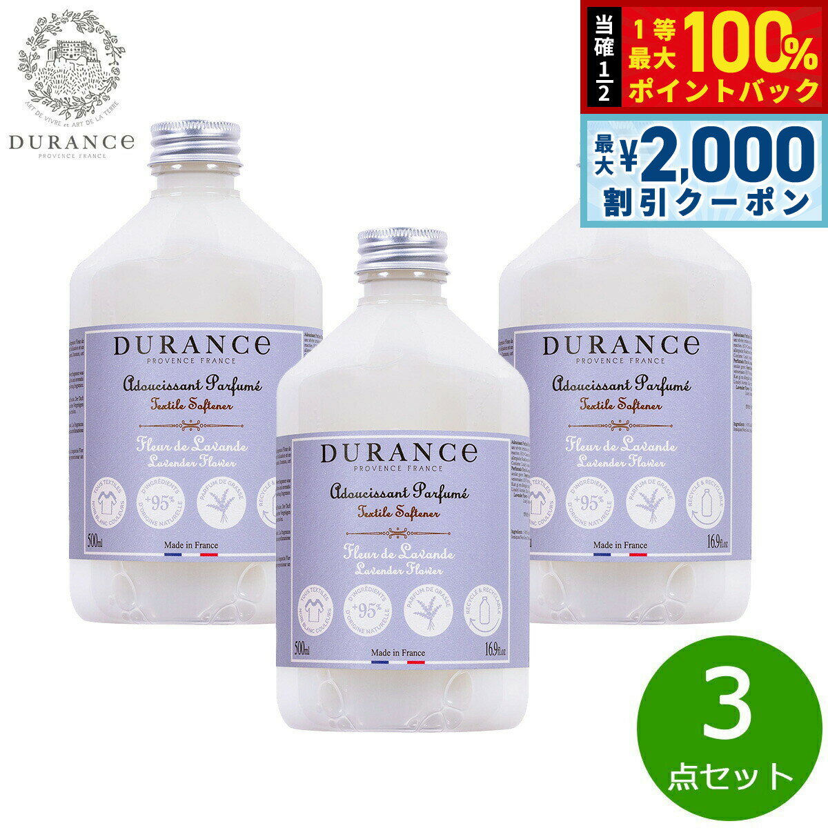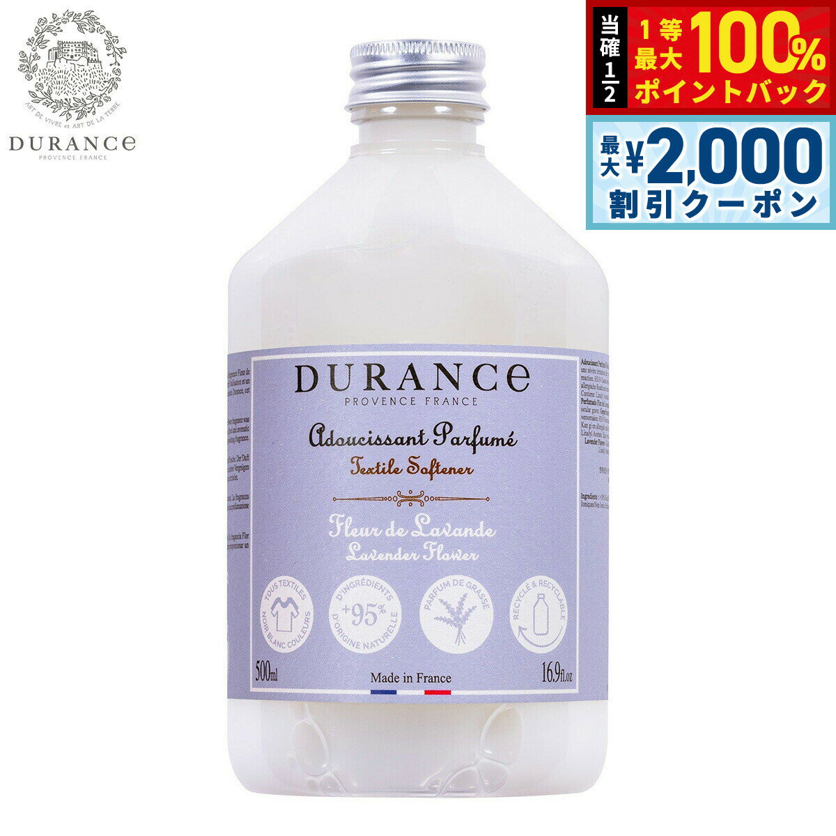 デュランス社のロングセラーランドリーアイテムが、リニューアルして新登場しました。着色料・防腐剤不使用・天然成分95%以上配合のソフナー(柔軟剤)です。ヘアケアの研究から生まれた特殊成分配合で静電気を防止し、洗濯物をエクストラソフトに仕上げます。「香りの都」フランス・グラース産の香料が、衣類をやさしく包みます。商品名DURANCE デュランス NEWソフナー(洗濯用柔軟剤) ラベンダーブランドDURANCE名称ソフナー(洗濯用柔軟剤)内容量500ml×3点原産国フランス デュランスが最もこだわっているのは「フレグランス」。自社が持つ畑と地元の農家で有機栽培された原料を熟練の調香師によって香りをブレンドしています。全ての商品は「香りの都」として世界的に有名な地、フランスのグラースで調香されています。香りを調香する調香師には位があります。デュランスの商品は、限られた人しか持っていない最上位ランク「マスターパフューマー」の称号を持つ調香師が、香りをブレンドし、つくっています。厳選された天然素材を使い熟練の調香師がブレンドするからこそ、上質でやさしい気品あふれる唯一無二のフレグランスが生まれるのです。【ラベンダー:安らぎを誘う優しいフローラルラベンダーの香り】トップ:ラベンダー、ローズマリー、ユーカリミドル:ラベンダー、クラリーセージ、クローブベース:パチュリ、ムスク、トンカ【安心に使える「7つのフリー」】・動物由来の原料の不使用・着色料フリー・防腐剤フリー・蛍光増白剤の不使用・石油系界面活性剤の不使用・ノンシリコン商品・アレルギーリスクを最小限に抑えた成分配合赤ちゃんや敏感肌の方の衣類でも安心して洗濯できます。ご使用方法と目安容量:通常の洗濯洗剤と同様に、すすぎ時に洗濯機35Lの水に対して30ml程度入れます。メーカー名DURANCE デュランス製造所株式会社イー・エフ・インターナショナル:東京都渋谷区千駄ヶ谷4-16-6DURANCE デュランス NEWソフナー(洗濯用柔軟剤) ラベンダーデュランス社のロングセラーランドリーアイテムが、リニューアルして新登場しました。着色料・防腐剤不使用・天然成分95%以上配合のソフナー(柔軟剤)です。ヘアケアの研究から生まれた特殊成分配合で静電気を防止し、洗濯物をエクストラソフトに仕上げます。「香りの都」フランス・グラース産の香料が、衣類をやさしく包みます。