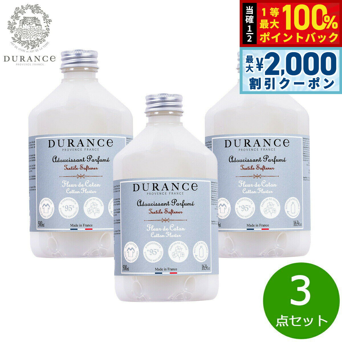 デュランス社のロングセラーランドリーアイテムが、リニューアルして新登場しました。着色料・防腐剤不使用・天然成分95%以上配合のソフナー(柔軟剤)です。ヘアケアの研究から生まれた特殊成分配合で静電気を防止し、洗濯物をエクストラソフトに仕上げます。「香りの都」フランス・グラース産の香料が、衣類をやさしく包みます。商品名DURANCE デュランス NEWソフナー(洗濯用柔軟剤) コットンフラワーブランドDURANCE名称ソフナー(洗濯用柔軟剤)内容量500ml×3点原産国フランス デュランスが最もこだわっているのは「フレグランス」。自社が持つ畑と地元の農家で有機栽培された原料を熟練の調香師によって香りをブレンドしています。全ての商品は「香りの都」として世界的に有名な地、フランスのグラースで調香されています。香りを調香する調香師には位があります。デュランスの商品は、限られた人しか持っていない最上位ランク「マスターパフューマー」の称号を持つ調香師が、香りをブレンドし、つくっています。厳選された天然素材を使い熟練の調香師がブレンドするからこそ、上質でやさしい気品あふれる唯一無二のフレグランスが生まれるのです。【コットンフラワー:パウダリーでフローラル系のコットンの香り】トップ:ベルガモット、コットンフラワー、スミレミドル:ローズ、ジャスミン、アイリスベース:サンダルウッド、ムスク、ヘリオトロープ【安心に使える「7つのフリー」】・動物由来の原料の不使用・着色料フリー・防腐剤フリー・蛍光増白剤の不使用・石油系界面活性剤の不使用・ノンシリコン商品・アレルギーリスクを最小限に抑えた成分配合赤ちゃんや敏感肌の方の衣類でも安心して洗濯できます。ご使用方法と目安容量:通常の洗濯洗剤と同様に、すすぎ時に洗濯機35Lの水に対して30ml程度入れます。メーカー名DURANCE デュランス製造所株式会社イー・エフ・インターナショナル:東京都渋谷区千駄ヶ谷4-16-6DURANCE デュランス NEWソフナー(洗濯用柔軟剤) コットンフラワーデュランス社のロングセラーランドリーアイテムが、リニューアルして新登場しました。着色料・防腐剤不使用・天然成分95%以上配合のソフナー(柔軟剤)です。ヘアケアの研究から生まれた特殊成分配合で静電気を防止し、洗濯物をエクストラソフトに仕上げます。「香りの都」フランス・グラース産の香料が、衣類をやさしく包みます。