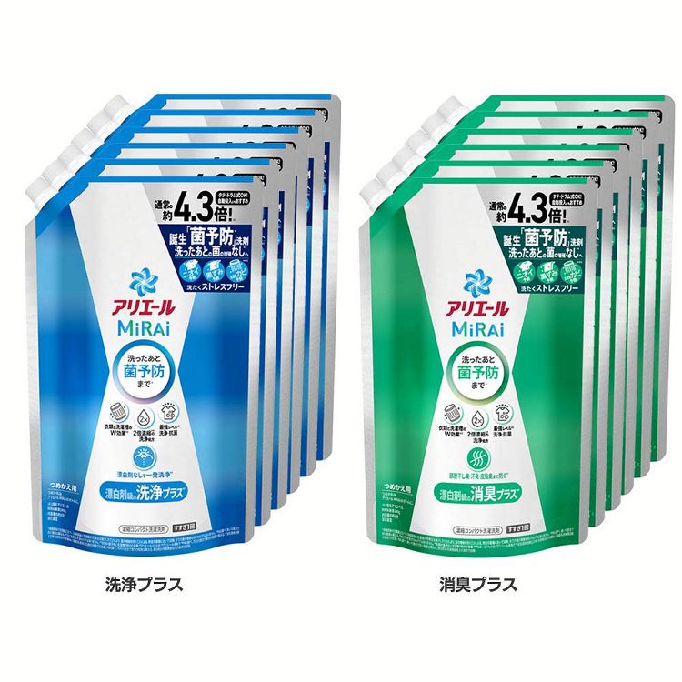 特許手法!洗ったあと菌予防まで。洗ったあとも菌の増殖なしへ。※1W効果!洗濯槽も防カビ!※2※6最強レベル抗菌・洗浄!※3 黄ばみもすっきり。部屋干し臭・汗臭・皮脂臭まで防ぐ ※4着ている服のしつこいニオイ予防 ※4タオルの黒ずみ予防2倍濃縮コンパクト!※5 すすぎ1回!節水・節電タテ・ドラム式・自動投入洗濯機OK※ 当社液体洗剤と23年10月時点の市場No.1酸素系液体漂白剤の併用での比較。P&G調べ。臭いの度合で防ぐ程度は異なる。漂白剤は洗濯機直投入の条件で試験。 ※1 接種直後の生菌数と比べ、18時間後に生菌数が同等又は減少したことにより、菌の増殖を防ぐことによる。特定の菌種において試験。全ての菌の増殖を防ぐわけではありません。※2 衣類の菌予防と洗濯槽の防カビ効果 ※3 アリエール液体で ※4 P&G調べ。臭いの度合で防ぐ程度は異なる。 ※5 アリエールジェル比 ※6 カビを除去するわけではありません。特許手法!洗ったあと菌予防まで。洗ったあとも菌の増殖なしへ。※1W効果!洗濯槽も防カビ!※2※6最強レベル抗菌・洗浄!※3 黄ばみもすっきり。部屋干し臭・汗臭・皮脂臭まで防ぐ ※4着ている服のしつこいニオイ予防 ※4タオルの黒ずみ予防2倍濃縮コンパクト!※5 すすぎ1回!節水・節電タテ・ドラム式・自動投入洗濯機OK※ 当社液体洗剤と23年10月時点の市場No.1酸素系液体漂白剤の併用での比較。P&G調べ。臭いの度合で防ぐ程度は異なる。漂白剤は洗濯機直投入の条件で試験。 ※1 接種直後の生菌数と比べ、18時間後に生菌数が同等又は減少したことにより、菌の増殖を防ぐことによる。特定の菌種において試験。全ての菌の増殖を防ぐわけではありません。 ※2 衣類の菌予防と洗濯槽の防カビ効果。 ※3 アリエール液体で。 ※4 P&G調べ。臭いの度合で防ぐ程度は異なる。 ※5 アリエールジェル比。 ※6 カビを除去するわけではありません。 <洗浄プラス/消臭プラス共通> ●商品サイズ(cm) 幅約19.7×奥行約9.4×高さ約30.9 ●内容量 1.22kg×6 ●成分 界面活性剤(50%:直鎖アルキルベンゼンスルホン酸塩、ポリオキシエチレンアルキルエーテル)、安定化剤、分散剤、香料、洗浄助剤、蛍光増白剤、酵素 ※これは飲み物ではありません。 使用上の注意:子供の手の届くところに置かない。認知症の方などの誤飲を防ぐため、置き場所に注意する。用途以外に使用しない。荒れ性の方や長時間使う場合、また原液で使う場合は炊事用手袋を使う。使用後は水で手をよく洗い、クリームなどでお手入れをおすすめします。原液が洗濯機のフタについた時は、水ですぐ拭き取る。窒息の原因になる可能性がありますので、容器キャップは常に固く締め、お子様が誤って口にいれないようにしてください。 応急処置:万一飲み込んだ場合は水を飲ませる、また、目に入った場合はこすらずに水でよく洗う等応急処置をし、医師に相談する。 (検索用:アリエール 液体洗剤 ミライ 洗濯洗剤 部屋干し ニオイ予防 汗臭 洗浄 菌予防 詰め替え 4987176244147 4987176244130) 最強翌日配送対象商品に関するご案内 最強翌日配送対象商品・対象地域に該当する場合は最強翌日配送マークがご注文カゴ近くに表示されます。 最強翌日配送可能なお支払方法は【クレジットカード、代金引換、全額ポイント支払い】のみとなります。 下記の場合は最強翌日配送対象外となります。 ・15点以上ご購入いただいた場合 ・時間指定がある場合 ・ご注文時備考欄にご記入がある場合 ・決済処理にお時間を頂戴する場合 ・郵便番号や住所に誤りがある場合 ・最強翌日配送対象外の商品とご一緒にご注文いただいた場合 ・お届け先住所文字数が40文字以上の場合