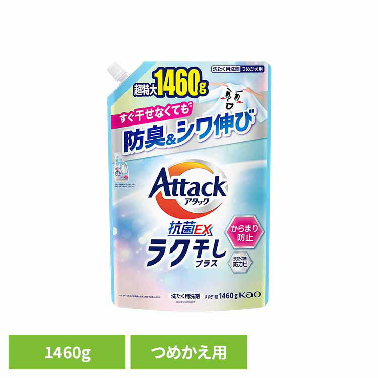 お洗たくをもっとラクに。 すぐ干せなくても、放置臭も強力防臭&ひと振りでシワ伸び!からまり防止! シワが気になる衣類も仕上がりキレイで干すときラク。からまらず、するする取り出せる! 汚れ・ニオイを強力洗浄。 ・洗たく槽防カビ*1 ・24時間抗菌*1 ・からまり防止 ・フレッシュフローラルの香り ・部屋干し防臭 ・外干しOK ・すすぎ1回 *1 すべての菌・カビの増殖を抑えるわけではありません ※リニューアルに伴い、パッケージ・内容等予告なく変更する場合がございます。予めご了承ください。 ●内容量 1460g(つめかえ用) ●商品サイズ(cm) 幅約20×奥行約12×高さ約31.5 ●成分 界面活性剤[16 %、ヒドロキシアルカンスルホン酸塩]、安定化剤、pH調整剤 ●使用上の注意 用途外に使わない。 子供の手の届く所に置かない。 認知症の方等の誤飲を防ぐため、置き場所に注意する。 使用後は手をよく洗う。 荒れ性の方や長時間又は原液で使う場合は炊事用手袋を使う。 原液が洗たく機のフタ等についた時はすぐに水でふきとる。放置すると傷むことがある。 ※低温で凍った場合、常温に戻してお使いください。 ●つめかえ方 ご注意 「アタック抗菌EX ラク干しプラス」のボトルにつめかえる。あふれることがあるので、注意してつめかえてください。 他の洗剤とまぜると、液が濁ったり、固まることがある。 液モレすることがあるので、つめかえ後は必ずキャップを閉めて立てて保管する。 この商品をつめかえずにそのまま使用しない。 開封後は出来るだけ早く使い切る。 自動投入機能付き洗たく機の洗剤タンクを使う場合は、洗たく機の取扱説明書に従う。(使用量は水量30Lに対して30ml) お問合せの際に必要な場合があるため、このパックを保管する。 パックを強く持つと、液が飛び出ることがあるので注意する。 (検索用:洗剤 アタック 液体洗剤 詰め替え 洗濯 抗菌EX ラク干し 大容量 花王 強力洗浄 4901301455079) 最強翌日配送対象商品に関するご案内 最強翌日配送対象商品・対象地域に該当する場合は最強翌日配送マークがご注文カゴ近くに表示されます。 最強翌日配送可能なお支払方法は【クレジットカード、代金引換、全額ポイント支払い】のみとなります。 下記の場合は最強翌日配送対象外となります。 ・15点以上ご購入いただいた場合 ・時間指定がある場合 ・ご注文時備考欄にご記入がある場合 ・決済処理にお時間を頂戴する場合 ・郵便番号や住所に誤りがある場合 ・最強翌日配送対象外の商品とご一緒にご注文いただいた場合 ・お届け先住所文字数が40文字以上の場合
