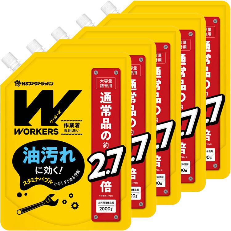 プロ仕様 WORKERS(ワーカーズ) 作業着や作業服専用の洗濯用液体洗剤がリニューアル。作業着特有の頑固な汚れに対して高い洗浄力を発揮します。頑固な油汚れにすばやく浸透し、汚れを強力に洗浄します。ギトギトした油でも負けず、へたらないスタミナのある泡で頑固な汚れを除去します。汗・皮脂汚れにも効果を発揮、ニオイをもとから除去します。色柄ものにも使用できます。(無けい光)調理服、運動着、各種ユニホームにも、普段のお洗濯にも使えます。ドラム式にも使用できます。すすぎ2回。●内容量2000g●商品サイズ(cm)幅約22×奥行約5.6×高さ約30●商品重量約2.038kg●成分界面活性剤(22% ポリオキシエチレンアルキルエーテル、脂肪酸系(非イオン)、直鎖アルキルベンゼンスルホン酸ナトリウム)、アルカリ剤、安定化剤(検索用:ユニフォーム 工場 作業服 詰め替え 詰替え 詰め換え 詰換え 2000g 2kg 洗剤 4902135144719) 関連キーワード(本商品の説明ではありません)母の日 父の日 敬老の日 こどもの日 クリスマス バレンタイン ホワイトデー ハロウィン お正月 成人の日 成人式 記念日 誕生日 卒業式 入学式 お歳暮 お中元 春 夏 秋 冬 梅雨 節分 ひな祭り 七夕 十五夜 初詣 年越し 夏祭り 花火大会 結婚祝い 内祝い 出産祝い 快気祝い 還暦祝い 古希 喜寿 傘寿 米寿 卒寿 白寿 百寿 新築祝い 引っ越し祝い 開店祝い 開業祝い 就職祝い 昇進祝い 合格祝い 銀婚式 金婚式 七五三 長寿祝い 御礼 お母さん お父さん 義母 義父 祖父 祖母 おばあちゃん おじいちゃん 娘 息子 彼氏 彼女 恋人 友達 上司 先輩 後輩 同僚 キッズ 子供 幼児 ベビー 赤ちゃん 育児 学生 社会人 シニア 10代 20代 30代 40代 50代 60代 70代 80代 90代 一人暮らし 単身赴任 主婦 主夫 新生活 家族暮らし 子育て 旅行 トラベル ライブ ホームパーティ ビジネス 法人 ギフト プレゼント 最強翌日配送対象商品に関するご案内 最強翌日配送対象商品・対象地域に該当する場合は最強翌日配送マークがご注文カゴ近くに表示されます。 最強翌日配送可能なお支払方法は【クレジットカード、代金引換、全額ポイント支払い】のみとなります。 下記の場合は最強翌日配送対象外となります。 ・15点以上ご購入いただいた場合 ・時間指定がある場合 ・ご注文時備考欄にご記入がある場合 ・決済処理にお時間を頂戴する場合 ・郵便番号や住所に誤りがある場合 ・最強翌日配送対象外の商品とご一緒にご注文いただいた場合 ・お届け先住所文字数が40文字以上の場合 様々な商品を取り扱っております - こんなイベント / 行事に - ギフト プレゼント 贈り物 お返し 祝い 出産準備 出産祝い 誕生日 誕生祝い ハーフバースデー 入園 入園式 入学 入学式 卒園 卒園式 卒業 卒業式 新学期 - 誰へ - 男の子 女の子 赤ちゃん ベビー 子供 子ども こども 娘 息子 孫 甥っ子 姪っ子 小学生 中学生 高校生 大学生 社会人 友達 友人 親戚 兄弟 姉妹 ママ友 妻 旦那 夫お届け先が沖縄・離島の場合、お届け日時のご希望に沿えない場合がございます。予めご了承ください。