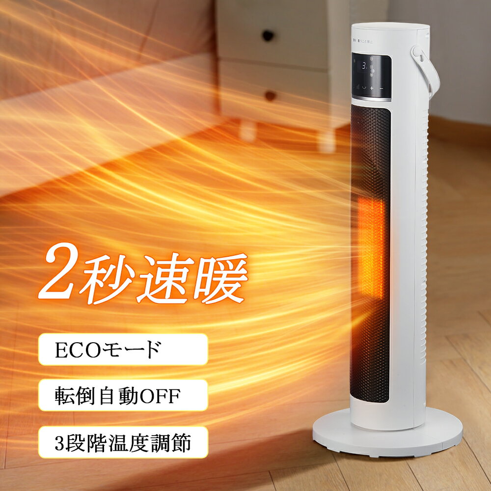 【2秒速暖・PTCセラミック加熱】速暖タワー型セラミックファンヒーターが新登場♪本電気ファンヒーターは高品質な安全性高いPTCセラミック加熱素材を採用し、僅か2秒で急速に加熱でき、燃料がなく、直火なし、燃焼の臭い匂いがないセラミックヒーターです。寒い冬の中、起床時や帰宅時とか、脱衣所、洗面所、寝室、仕事場のオフィスにとこでもご使用いただけます。特に、勉強の時とか料理を作る時とか仕事する時とか、足元に置くのは一番適用です。 【左右首振り&3段階送風&ECOモード】左右自動度首振り、大風量立体送風、従来品の電気ファンヒーターと比べで送風範囲さらにアップします。高温・低温・送風の3段階出力モードがあり、効率よく温かさをお届けます。それに、最先端のECOモードを搭載しており、自分の好みの温度を設定できます。無駄な電気を使わない省エネ設計で、節電しながら快適に感じる温度を簡単的に調節できます。 【無臭&多重保護機能】本製品はPSE認証済の電気ファンヒーターで難燃性高い防火素材ABSを採用され、転倒自動OFFや過熱対策など安全対策満載ファンヒーターです。地震などの災害時やうっかり倒してしまったときでも電源が自動的に切ります。大切なお子様やペットの安全を考慮しました。石油やガスファンヒーターなどと違い、セラミックヒーターは一酸化炭素などの有害ガスが出ないため、無臭安全でご使用いたただけます。 【タイマー機能&操作簡単】便利な1-12時間タイマー機能付き、1Hを単位で総計12段階のタイマーを設定できます。電源の消し忘れを防ぐ、布団から出たくない就寝する前に予め時間を設定しておけば寝ている間で電気代が掛かりすぎることがなく、余計な電気代も節約でるセラミックファンヒーターです。この電気ファンヒーターは高級感溢れる大画面LEDディスプレイも搭載しており、温度やタイマー機能などヒーターの運転状態が一目で確認できます。 【コンパクト&持ち運び便利】コンパクト軽量のデザイン、取りやすい取っ手もあり、女性が運んでもラクラク、放置にも収納にも便利です。リビングはもちろん、キッチンや脱衣所などの狭い場所でスポット暖房として使うのに大人気です。寒い冬を暖かく過ごす防寒グッズとして、友達や家族へのプレゼントに適用です。