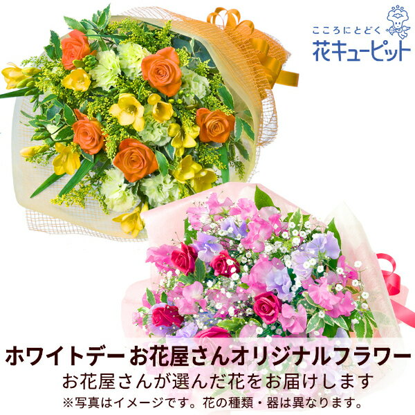 ■【ホワイトデー 花屋さんおすすめギフト】【花屋オリジナル】ホワイトデーの花束 花束 11990 円(税込)お届け先近くのお花屋さんが心を込めて作る、オリジナルデザインのホワイトデーのフラワーギフトです。花の種類・ラッピングはお花屋さんにおまかせください。ホワイトデーに最適な花をお届けいたします。ホワイトデーには「ありがとう」を込めたフラワーギフトを贈りましょう。ロマンチックなお花のプレゼントが気持ちを届けてくれます。お届け先近くの花キューピットのお店から、メッセージカード付で直接お届けいたします。※商品価格にはご利用手数料990円(税込)が含まれております。※配達不能な区域がありますので必ずご確認ください。配達不能地域へのご注文についてはキャンセルとさせていただきます。【色合い】:ミックス【スタイル】:おまかせ【主な花材】:ミックス系メイン(ホワイトデー)【サイズ】:おまかせ【こんなご用途に】:ホワイトデー・バレンタインのお返し・感謝の気持ちご注文に関する注意事項※写真はイメージです。 地域・季節によって、一部花材・花器等が異なる場合がございます。商品価格にはご利用手数料990円(税込)が含まれております。※配達不能な区域がありますのでご確認ください。配達不能地域へのご注文についてはキャンセルとさせていただきます。※メッセージカードは無料にてお付けします。※メッセージカードにはお名前は入りません。必要な場合はメッセージ内にご記入ください。 『 無 料 メ ッ セ ー ジ ご 利 用 の 方 へ 』 ●「定型文をご利用の場合」 ・上記商品欄の【メッセージ】を選択 ●「フリー入力をご利用場合」※産直ギフトはご記入していただいても、対応できません。 ・メッセージの入力場所:注文確認画面内の備考欄にございます、メッセージ入力欄にて承ります。 ・メッセージの文字制限:差出人のお名前を含み30文字まで。絵文字、機種依存文字などの文字は使用できません。 ※フリー入力をご利用の場合、上記商品欄の【メッセージ】で選択されたメッセージは記載されませんお届け日について※ご購入商品、お支払い方法により詳細が異なりますのでご注意ください。 ※コンビニ前払いの場合は:入金期限日前迄にご入金ください。※コンビニ前払いの場合、お花のご手配は入金後となります。期日までにお支払いが確認できない場合は、キャンセル扱いとさせていただきます。カード決済エラーによる入金遅延もこれに準じます。 注文後に送付されます【注文確認メール】に記載のある、支払い期日までにご入金ください。お届け先へ事前に在宅確認の連絡をする場合があります。なお、連絡がつかない場合は、ご指定の日時にお届けができない場合がございます。■コンビニ前払い際の注意ご注文後に、お支払い受付番号を記載したメールを楽天市場からお送りいたします。お支払いの際にはお支払い受付番号が必要です。※お届け希望日前日を過ぎての入金の場合、入金期限内でもお届け日を変更させていただく場合がございます。予めご了承ください。