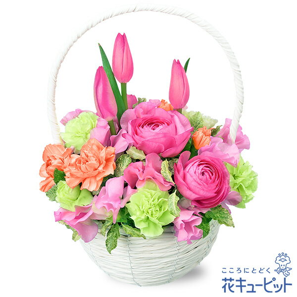 ■【チューリップ特集】ピンクチューリップのナチュラルバスケット アレンジメント/オールラウンド 5940 円(税込)幾重にも重なった花びらがエレガントなラナンキュラスと、親しみのある可愛らしいチューリップをあわせた春らしいアレンジメント。鮮やかな色の花々が心を明るくしてくれます。どこから見ても花を楽しめるので、テーブルの真ん中などに飾りやすいスタイルとなっています。世界中で愛されて続けているチューリップ。花言葉の「美しい瞳 恋の告白(赤)、新しい恋」。春の訪れが待ち遠しいこの季節に最適なフラワーギフトお届け先近くの花キューピットのお店から、メッセージカード付で直接お届けいたします。※商品価格にはご利用手数料990円(税込)が含まれております。※配達不能な区域がありますので必ずご確認ください。配達不能地域へのご注文についてはキャンセルとさせていただきます。【色合い】:ミックス【スタイル】:アレンジメント【主な花材】:濃ピンクラナンキュラス、ピンクチューリップ【サイズ】:高さ26×幅20×奥行20cm(花サイズ)【こんなご用途に】:お誕生日・合格祝い・入学祝い・卒業祝い・就職祝い・異動、転勤祝い・退職祝い・歓送迎・新築祝いなどのお祝いご注文に関する注意事項※写真はイメージです。 地域・季節によって、一部花材・花器等が異なる場合がございます。商品価格にはご利用手数料990円(税込)が含まれております。※配達不能な区域がありますのでご確認ください。配達不能地域へのご注文についてはキャンセルとさせていただきます。※メッセージカードは無料にてお付けします。※メッセージカードにはお名前は入りません。必要な場合はメッセージ内にご記入ください。 『 無 料 メ ッ セ ー ジ ご 利 用 の 方 へ 』 ●「定型文をご利用の場合」 ・上記商品欄の【メッセージ】を選択 ●「フリー入力をご利用場合」※産直ギフトはご記入していただいても、対応できません。 ・メッセージの入力場所:注文確認画面内の備考欄にございます、メッセージ入力欄にて承ります。 ・メッセージの文字制限:差出人のお名前を含み30文字まで。絵文字、機種依存文字などの文字は使用できません。 ※フリー入力をご利用の場合、上記商品欄の【メッセージ】で選択されたメッセージは記載されませんお届け日について※ご購入商品、お支払い方法により詳細が異なりますのでご注意ください。 ※コンビニ前払いの場合は:入金期限日前迄にご入金ください。※コンビニ前払いの場合、お花のご手配は入金後となります。期日までにお支払いが確認できない場合は、キャンセル扱いとさせていただきます。カード決済エラーによる入金遅延もこれに準じます。 注文後に送付されます【注文確認メール】に記載のある、支払い期日までにご入金ください。お届け先へ事前に在宅確認の連絡をする場合があります。なお、連絡がつかない場合は、ご指定の日時にお届けができない場合がございます。■コンビニ前払い際の注意ご注文後に、お支払い受付番号を記載したメールを楽天市場からお送りいたします。お支払いの際にはお支払い受付番号が必要です。※お届け希望日前日を過ぎての入金の場合、入金期限内でもお届け日を変更させていただく場合がございます。予めご了承ください。