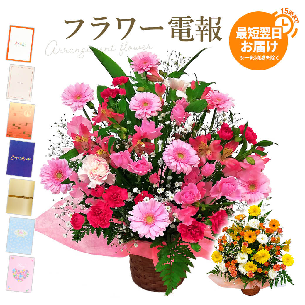アレンジメントフラワーについて >季節ごとの新鮮な花々を丁寧にアレンジし、自然の美しさを引き出したアレンジメントフラワーは、贈り物のフラワーギフトとして最適です。大切な方への結婚祝いや、友人への誕生日のサプライズギフト、母の日・長寿祝いなどのお祝いの花ギフトや、お得意様の開店祝い・開業祝い・開院祝いや取引先・得意先の就任・昇進などのさまざまなお祝いシーンで喜ばれます。 また、立札(名札)をお付けすることができます。ご用途に合わせて「御結婚御祝」「祝 還暦」「御就任御祝」「祝 御開店」などの表書き(飾り文字)や、お花の送り主様のお名前を記入でき、連名で送ることもできます。 楽天ランキングで上位受賞している幅広いラインナップの商品があります。 アレンジメントフラワーの一覧はこちら 電報屋のエクスメールの特徴 電報屋のエクスメールは、文字数で料金がかからないリーズナブルな電報サービスです。 最速で即日発送・翌日配達の配送で、急ぎの電報を迅速にお届けします。土曜・日曜・祝日も休まず営業!(※年末年始、GW等の休業日除く) 送り方も手軽で簡単。文例集からメッセージの例文を選ぶだけでスピーディに申し込めます。 初心者の方には親切にサポートしますので、お気軽にお問い合わせください。 また、当店は適格請求書発行事業者です。インボイス制度対応の領収書は商品発送後、購入履歴から発行できます。 主な用途 都合でどうしても出席・参列できない結婚式のお祝い花を挙式・披露宴会場にお届けします。新郎・新婦からお互いへウェディングのサプライズギフトでもおすすめ。 会社員や社会人の方にはフォーマルなビジネスの贈り物でも利用できます。取引先の入社式・竣工式・上棟式・落成式や事務所開き、新築・移転祝い、社長・会長の就任祝い、職場の上司・部下・同僚の昇進・栄転祝い、会社の創立記念・周年祝い・表彰式・コンペ景品、大切なお客様の支店・営業所設立の開設祝い、起業や独立祝い、弁護士・税理士など士業の開所祝い、新規事業・会社設立など開業祝い、ホテル・商業施設のグランドオープンやリニューアル、新規出店、上場祝い、歯科医院・整骨院・薬局など医院・病院・クリニックの開院祝い、内覧会、カフェ・飲食店・ギャラリー・画廊・雑貨店・美容院・エステ・ネイルサロンなどの開店祝い、学習塾・音楽教室・英会話・バレエ・料理教室など教室や学校の開校祝い、退職者への退職祝いや送別会のフラワーギフトに。 引っ越し祝い、マイホーム購入、新築祝い、リフォーム祝い。男の子や女の子のお子様・お孫さん、兄弟・姉妹・恋人・友達の誕生日にバースデープレゼント。夫から&妻からの夫婦間、息子さん・娘さんから離れて暮らすご両親への結婚記念日・銀婚式・金婚式のお祝いに。 父親・母親・祖父・祖母・義父・義母の還暦・古希(古稀)・喜寿・米寿・卒寿・白寿などの長寿祝い(賀寿祝い)にもオススメ。自宅だけでなく高齢者施設や老人ホーム、入院している病院宛にも対応。 お世話になっている先生や教授の叙勲・褒章の受章祝いに。 選挙の激励に、出馬された候補者への応援として、事務所の開設祝い・陣中見舞い・出陣式・祈大勝・祈必勝や、当選祝いに。 学校・幼稚園・保育園へ先生・保護者・PTA・OB・体操クラブから卒業生・卒園生・教え子への卒業式・卒園式のフラワーアレンジメント。母校や関係先の小学校・中学・高校・大学の新入生の入学式への入学祝いの花ギフトに。 推しのアーティストのコンサート・ライブ・フェス・舞台・演劇の公演祝い・楽屋見舞い・祝花に。叔父さん・叔母さんから甥っ子・姪っ子の習い事の発表会(ピアノ・バレエ・ダンス)や演奏会、家族・親戚・知人の個展・展覧会・展示会へのお祝いにも利用されてます。 出産祝い・成人の日に成人式への成人祝い、母の日・父の日・敬老の日・孫の日・クリスマスなど季節のイベントのギフトにも最適。 その他の用途・イベント・・・パーティー 二次会 食事会 ブライダル ギフト プレゼント 贈答品 ジューンブライド 婚約祝い お礼 感謝 手紙 メッセージカード 便せん お便り 贈りもの バースデイ 進級祝い 合格祈願 合格祝い 就職祝い お見舞い 快気祝い 退院祝い 引越し祝い 引越祝い 出版 運動会 甲子園出場 全国大会出場 入賞祝い 入選祝い お年賀 バレンタインデー チョコ以外 ホワイトデー いい夫婦の日 入園式 入園祝い 初節句 こどもの日 ひな祭り 端午の節句 桃の節句 暑中見舞い 残暑見舞い 寒中見舞い 歓迎会 送迎会 送別祝い 退官祝い 人事異動 選挙応援 定期大会 記念パーティ 結婚記念日 結婚1周年(紙婚式) 結婚3周年(革婚式) 4周年(花と果実婚式) 5周年(木婚式) 10周年(アルミ婚式・スイートテン) 15周年(水晶婚式) 20周年(磁器婚式) 25周年(銀婚式) 30周年(真珠婚式) 40周年(ルビー婚式) 50周年(金婚式) 贈る相手 女性 男性 母 義母 父 義父 お父さん お母さん おじいちゃん おばあちゃん 子供 子
