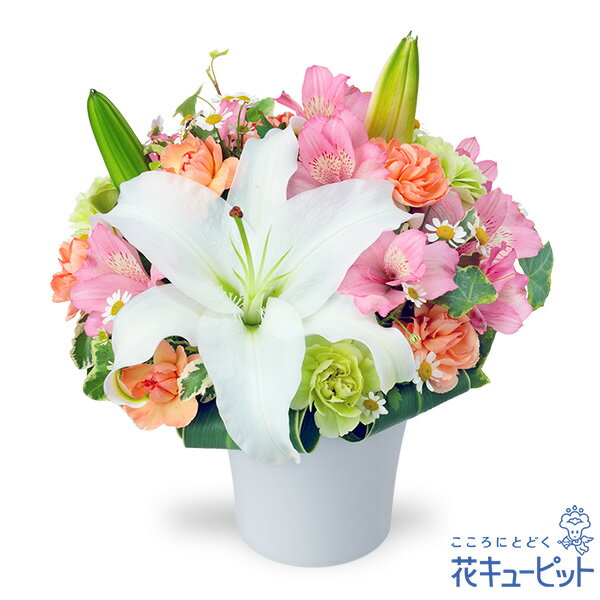 ■【誕生日フラワーギフト】ユリとアルストロメリアのエレガントアレンジメント アレンジメント/オールラウンド 5390 円(税込)上品で存在感のある白のユリと、ピンクのアルストロメリアをあわせたアレンジメント。清楚でありながら可愛らしい印象に仕上げました。ユリの花言葉は「威厳」で、目上の人へのギフトとして人気があります。誕生日や退職祝い、結婚祝いなどのプレゼントにおすすめです。お誕生日を迎える方には最適なプレゼント。あなたのセンスが光るギフトです。お届け先近くの花キューピットのお店から、メッセージカード付で直接お届けいたします。※商品価格にはご利用手数料990円(税込)が含まれております。※配達不能な区域がありますので必ずご確認ください。配達不能地域へのご注文についてはキャンセルとさせていただきます。【色合い】:ミックス【スタイル】:アレンジメント【主な花材】:白オリエンタル系ユリ、ピンクアルストロメリア【サイズ】:高さ25×幅23×奥行23cm【こんなご用途に】:誕生日・お祝い・記念日・両親への感謝の気持ちご注文に関する注意事項※写真はイメージです。 地域・季節によって、一部花材・花器等が異なる場合がございます。商品価格にはご利用手数料990円(税込)が含まれております。※配達不能な区域がありますのでご確認ください。配達不能地域へのご注文についてはキャンセルとさせていただきます。※メッセージカードは無料にてお付けします。※メッセージカードにはお名前は入りません。必要な場合はメッセージ内にご記入ください。 『 無 料 メ ッ セ ー ジ ご 利 用 の 方 へ 』 ●「定型文をご利用の場合」 ・上記商品欄の【メッセージ】を選択 ●「フリー入力をご利用場合」※産直ギフトはご記入していただいても、対応できません。 ・メッセージの入力場所:注文確認画面内の備考欄にございます、メッセージ入力欄にて承ります。 ・メッセージの文字制限:差出人のお名前を含み30文字まで。絵文字、機種依存文字などの文字は使用できません。 ※フリー入力をご利用の場合、上記商品欄の【メッセージ】で選択されたメッセージは記載されませんお届け日について※ご購入商品、お支払い方法により詳細が異なりますのでご注意ください。 ※コンビニ前払いの場合は:入金期限日前迄にご入金ください。※コンビニ前払いの場合、お花のご手配は入金後となります。期日までにお支払いが確認できない場合は、キャンセル扱いとさせていただきます。カード決済エラーによる入金遅延もこれに準じます。 注文後に送付されます【注文確認メール】に記載のある、支払い期日までにご入金ください。お届け先へ事前に在宅確認の連絡をする場合があります。なお、連絡がつかない場合は、ご指定の日時にお届けができない場合がございます。■コンビニ前払い際の注意ご注文後に、お支払い受付番号を記載したメールを楽天市場からお送りいたします。お支払いの際にはお支払い受付番号が必要です。※お届け希望日前日を過ぎての入金の場合、入金期限内でもお届け日を変更させていただく場合がございます。予めご了承ください。