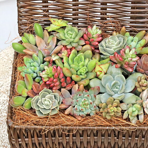 小さめ多肉植物をたっぷりギャザリング 華やかなアクセント 玄関 お庭 リビングに 現品販売 多肉植物寄せ植え ギャザリング ナチュラルアンティークかごbrownです。 ブラウンのナチュラルかごに多肉植物をたっぷりギャザリング(寄せ植え)しました。 容器は木製のかごのようなナチュラルな風合い。 プラスチック製なので水に濡れても耐久性があり長く使用できます。 (容器サイズ:約W17×D13×H20cm) 乾燥に強く育てやすい。寒くなると紅葉するものが多いので秋冬は色が綺麗に色付きます。 玄関、お庭、ベランダ、お部屋、テラスなどのアクセントに。 大切な方へのプレゼントにもおすすめです。 *育て方のプリントお付けします。 商品情報 サイズ 約W17×D13×H20cm カラー グリーン、ブラウン ※モニターの発色の具合によって実際のものと色が異なる場合がございます。 素材 プラスチック 育て方 風通し水はけ良く半日陰?日当たりのよい場所で管理します。 水やりは土の表面が乾いたらたっぷりあげます。1週間?2週間に1回程度。 肥料は春と秋に少量の緩効性肥料を与えます。それほど必要としません。 水やりが多い、多湿な環境、日当たりが悪いと徒長しやすいので なるべく日当たりが良く風通しの良いところで管理します。 注意事項 *植物は日々生長していますので、お届け時は写真と変わっている場合がございます。 *開花株の販売は咲き終わった花は摘み取りますので、花のない株でお届けする場合もあります。 *北海道・沖縄県への発送は佐川急便またはゆうパックを利用します。3980円以上ご購入で送料無料になりますが北海道・沖縄県は別途送料+1000円かかります。 *夏場は配送中トラックの中が高温となる為、受け取り次第すぐに風通しの良い半日陰に置いてください。 *冬季の寒冷地への発送はご遠慮させて頂いております。 *発送は通常2、3日以内(定休日を除く)に対応させて頂いております。 *ご不明な点がございましたらお気軽にご連絡くださいませ。