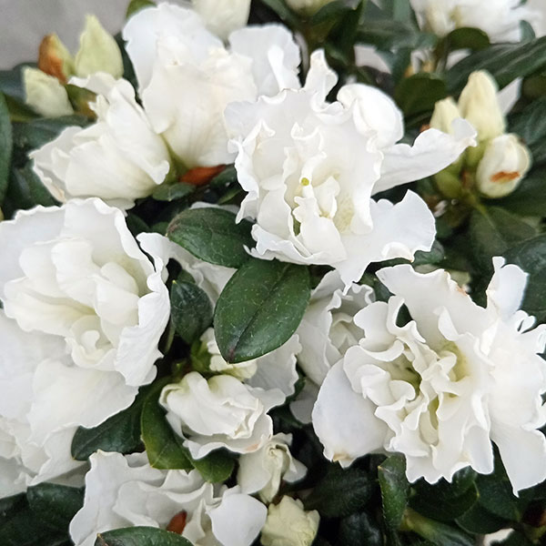 室内で長く楽しむインドア鉢花 最新品種の試験販売ベルギーアザレア:白八重(クリスティーンベリー)4号ポットベルギーの専門ナーセリー、Hortinno社のアザレアです。室内でより長く、豪華に楽しむインドアベルギーアザレア!アザレアは別名西洋ツツジ。国内では戸外で楽しむ鉢花として流通していますが、海外ではインドアで楽しむ鉢花となっています。「ベルギーアザレア」はHortinno社の開発した品種で、従来のアザレアに比べ、とても鮮やかな花色で、豪華な花です。開花中は室内の日が当たる窓辺でお楽しみください。涼しい場所で管理するとより長く花がきれいな状態を保ちます。また、霜が終わるころからは戸外でも管理できます。★写真はお届けする花の一例です。品種特性上、花色・花形は個体差があり、写真と若干異なる花でお届けする場合がありますので、ご了承ください★タイプツツジ科の半耐寒性常緑低木開花期3〜4月樹高40〜80cm日照日向むき【ベルギーアザレアの特徴】・室内でもきれいに咲きます。・部屋の空気をきれいにします(1鉢あたり約20平方メートル)・満開から1か月間、ずっと花が咲き続けます。【管理方法】○最適温度:5〜20度(最低マイナス5度)○置き場所:室内の明るい場所に置き、夏の直射は避けてください。○潅水方法:用土が乾いてきたらしっかりと用土へあげましょう。開花した花に直接水が当たるとシミの原因になります。蕾の内は乾燥し過ぎないように蕾への霧吹きなどが有効です。水が切れると葉が茶色くパリパリになってきます。冬場( 5 以下の場合)の水はほとんど要求されませんので与え過ぎにご注意ください。○花殻摘み:花が茶色く終わったら摘み取ってください。○剪定刈込:6月末までに刈り込みましょう。7月頃から翌年の花芽の付いた枝を形成します。○刈込方法:形を整えるように刈り込みましょう。浅くとも深くとも場所は選びません。○植え替え:刈り込み後、pH6前後のピートモス主体の用土へ 2サイズ UP(4号→6号)を基本にしてください。○肥培管理:7月上旬・10月頃に緩効性化成肥料を与えてください。○開花条件:花芽形成された枝が残っていること(7月の新枝)低温処理(5度程)が数日施され、昼の気温が20〜25程になると開花が促進されていきます。日光に多く当てると開花のスピードが早まりますが、反対に花が終わるのも早くなります。4号(直径約12cm)鉢植えです。※写真はイメージです。