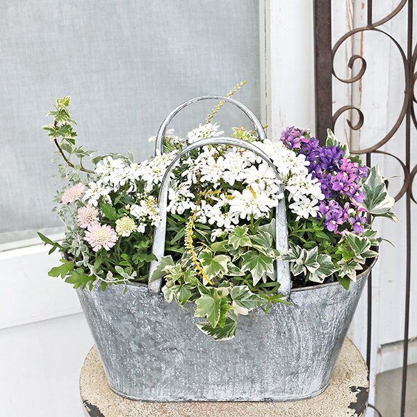 シンプルなブリキバスケットにナチュラルな寄せ植え 玄関 お庭のアクセント イベリス・ウィスラー、ネメシア・ディープブルー、スカビオサ・白ときどき桃、オレアリア・リトルスモーキー、カルーナ、ヘデラ・こもれびの季節の花寄せ植えです。 画像の現品販売、送料無料商品になります。 純白のイベリスが美しく、ダークパープルのネメシアとピンクのスカビオサ、グリーンを合わせてナチュラルシックに仕上げました。 容器はアンティーク風シャビーグレー色、持ち手の付いたバッグのようなブリキバスケットです。 (容器サイズ:約W30×D14×H30cm(深さ15cm) 底穴あり) イベリスは純白の花がたくさん咲く。形も整いやすい多年草。 ネメシアは寒さや暑さに強く四季咲き性多年草。 スカビオサは丈夫によく育つ。主に春と秋に咲く多年草。 オレアリアリトルスモーキーはシルバーリーフが美しい常緑低木。 カルーナは細く伸びる枝はがスタイリッシュ耐寒性常緑低木。 ヘデラは斑入り種が明るく這性よく伸びる多年草。 *培養土で植えています。 *ブリキポットはアンティーク調の仕上がりですので、ムラ、歪み、さび感などあります。 商品情報 サイズ 約W30×D14×H30cm(深さ15cm) カラー ホワイト、グリーン、パープル、グレー ※モニターの発色の具合によって実際のものと色が異なる場合がございます。 素材 ブリキ 排水穴あり 育て方 風通し、半日陰?日当たりの良い場所で管理します。 水やりは土の表面が乾いたら鉢底から水が出るまで、たっぷり水やりします。 (冬は1週間に1回程度。あくまでも目安ですので土の表面が乾いたら水やりしてください。) 肥料は春・秋に緩効性肥料を追肥してください。 花が咲き終わったらこまめに摘み取ります。 季節の変わり目(初夏頃)に植え替えをおすすめします。 注意事項 *植物は日々生長していますので、お届け時は写真と変わっている場合がございます。 *開花株の販売は咲き終わった花は摘み取りますので、花のない株でお届けする場合もあります。 *北海道・沖縄県への発送は佐川急便またはゆうパックを利用します。3980円以上ご購入で送料無料になりますが北海道・沖縄県は別途送料+1000円かかります。 *夏場は配送中トラックの中が高温となる為、受け取り次第すぐに風通しの良い半日陰に置いてください。 *冬季の寒冷地への発送はご遠慮させて頂いております。 *発送は通常2、3日以内(定休日を除く)に対応させて頂いております。 *ご不明な点がございましたらお気軽にご連絡くださいませ。