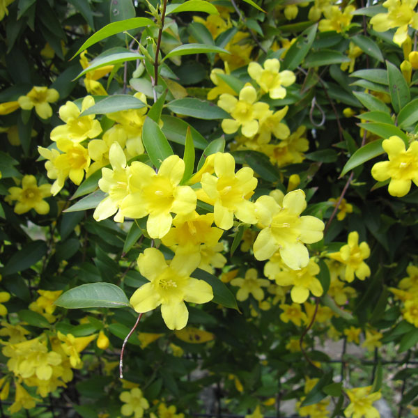 春に開花するつる性の丈夫な植物 フェンスやトレリス、壁面緑化に!カロライナジャスミン5号鉢植え黄色の香りのよい花を咲かせるカロライナジャスミンはつる性植物のなかでも人気の品種です。アメリカのカロライナ州近辺原産で、黄色い5弁の花を木いっぱいにさかせ、あたりを甘い香りで包みます。露地栽培での開花時期は3〜5月頃ですが、この鉢植えは温室で促成栽培したものなので、今年は冬の間に花を咲かせます。花が少ない時期に楽しめる人気の鉢花です。耐寒性はある程度ありますが、北関東以北では鉢植えで管理して冬は室内に取り込んでください。春以降は戸外の日当たりのよい場所で管理します。病虫害はほとんど見られず、強健です。生育力旺盛ですので、どんどん生長し、1年で2〜3mつるがのびます。庭植えにする場合はフェンスやトレリスやパーゴラにつるを誘引してください。光沢のある葉は濃い緑色で、秋から冬は黄色〜赤みを帯び、花のない時期も楽しめます。有毒植物なので口に入れないように注意します。タイプマチン科の耐寒性常緑つる性木本開花期3月下旬〜4月頃(ハウス栽培品は12月頃から開花)植付け適期10月〜6月栽培適地戸外の場合は関東地方以南の沿岸部、それ以外では鉢植えにして冬は室内にとりこんでください日照日向むき栽培方法:鉢植えの場合は表土が乾き次第水を与えます。多肥を好むので、春先と花が終わった後に緩効性肥料を多めに施してください。地植えにする場合は、水はけ、日当たりのよい場所に堆肥や腐葉土を多めにすきこんで植えつけます。風通しが悪くなったら花後につるをほぐし誘引しなおすか、つるを間引きます。初夏に挿し木で殖やすことができます。鉢のデザイン・色は写真と異なる場合があります。カロライナジャスミン5号鉢植えの栽培ガイドベランダ・ガーデニング(2)