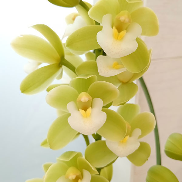 テーブルシンビジウム:一休2本立ち 5号鉢植え(皿付き)長く楽しめる小型のシンビジュームの鉢植えです。テーブルの上に乗せて鑑賞できるほどの愛らしさ。上手に管理すれば2ヶ月近くお花を楽しむことができます。「一休」は丸弁で小輪のグリーン花が魅力的な品種です。他のグリーン花の品種と比べ翌年以降も澄んだグリーンの花色を維持し易い特徴があります。花付きも良く性質も強健で育てやすい品種です。学名Cym. Sweetheart ‘Ikkyu’ 科/属ラン科 シンビジウム属原産地インド北部〜ミャンマー、タイ北部、中国雲南省など花言葉「飾らない心」「素朴」●水やり水は鉢の表面の水苔やバーグが乾いてから与えて下さい。目安としては、蕾があるときは週に2回程たっぷりと、満開になってからは5日に1回程、お花がないときは週に2〜3回程、たっぷりと与えてください。受け皿に水をためると根腐れの原因になりますので避けてください。乾燥する場所に置いている場合は、株全体にこまめに霧吹きなどで葉水を与えてください。●置き場所直射日光の当たらない明るい室内(半日陰の場所)に置いてください。リビングのレースのカーテン越し位の光が適しています。エアコンの風が直接当たる場所は避けてください。満開になってからは室内でも玄関先や廊下など比較的温度の低い場所におくとお花が長持ちします。霜の心配がなくなれば屋外での管理がおすすめです。軒下や、木陰など、直射日光が当たらない場所に置いてください。●適正温度生育適温25度以下、最低気温10度以上で、湿度60〜70%が理想的ですので、なるべくこの条件に近い場所で栽培します。●肥料お花が咲いている間は肥料の必要ありません。お花が枯れた後、新芽の成長にともない、真冬を避けた春から秋に肥料を施す事も有効です。肥料毎の用量を守り適量を施してください。●お花が枯れた後花は2ヶ月くらい楽しめますが、しおれるまでおくと新芽の成長が遅れるので、早めに花茎の根元から切り取り、切花として楽しむようにします。(一度花をつけたバルブから次の年に花が咲くことはありません)根元から花芽をつけるバルブ(卵型に膨らんだ芽)が立ち上がってきます。生育期にはそこから新芽がたくさん出ますが、そのままにしておくと養分が分散され生育不良となるので、新しい芽を1〜3本まで残し、他はかきとります。一般的には春先に出る元気の良い新芽を1つのバルブに1芽だけ残すようにします。晩春以降、新しい芽が脇から出ることがありますが、全てかきとります。10月中旬ころに室内にとりこみ、なるべく日当たりの良い場所で管理します。固形肥料は9月ころで終了とし、液肥は10月まで与えます。■お届け地域について ・北海道、東北、離島など、冬期間凍結の恐れがある地域、配送日数のかかる地域へのお届けができません。北海道へのお届けは別途1500円+消費税、沖縄へのお届けは別途2000円+消費税を加算させていただきます。 ※5号スクエア鉢入りです。※写真はイメージです。鉢の形状などは変更となる場合があります。テーブルシンビジウム:一休2本立ち 5号鉢植え(皿付き)の栽培ガイドシンビジュームの管理方法