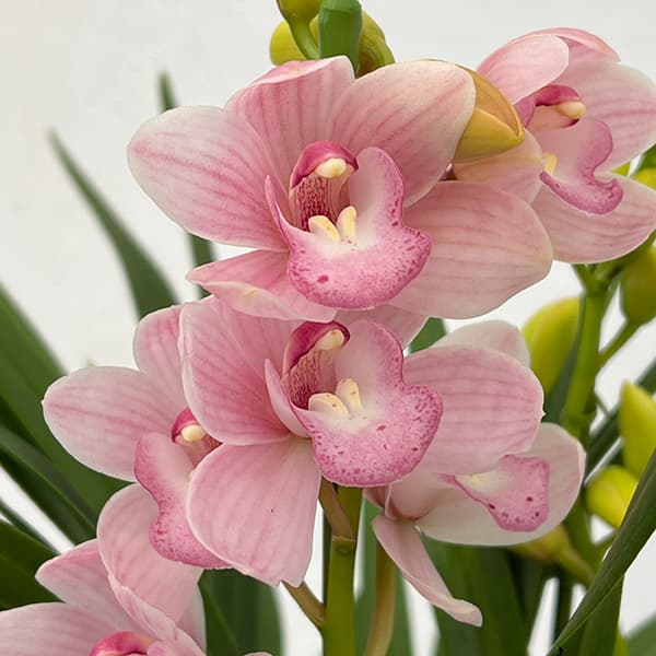 ベルベットリップが魅せる高級感あふれる小型シンビテーブルシンビジウム:森の精 永遠(とわ)2本立ち 5号鉢植え(皿付き)長く楽しめる小型のシンビジュームの鉢植えです。テーブルの上に乗せて鑑賞できるほどの愛らしさ。上手に管理すれば2ヶ月近くお花を楽しむことができます。「森の精 永遠(とわ)」は、石田蘭園が丹精込めて育種したオリジナルのシンビジウムです。その名の通り、いつまでも愛され続けるような優雅な美しさを持ち、淡いピンクの花びらには上品なグラデーションが入ります。リップ部分には可愛らしい模様が施され、花全体に柔らかで温かみのある雰囲気を漂わせます。鉢植えでも楽しめるコンパクトなサイズ感ながら、気品のある佇まいが魅力で、贈り物にも最適です。落ち着いた中にも華やかさを感じさせる特別なシンビジウム、「森の精 永遠(とわ)」の美しさをぜひお楽しみください。学名Cym. Forest Fairy 'Towa'科/属ラン科 シンビジウム属原産地インド北部〜ミャンマー、タイ北部、中国雲南省など花言葉「飾らない心」「素朴」●水やり水は鉢の表面の水苔やバーグが乾いてから与えて下さい。目安としては、蕾があるときは週に2回程たっぷりと、満開になってからは5日に1回程、お花がないときは週に2〜3回程、たっぷりと与えてください。受け皿に水をためると根腐れの原因になりますので避けてください。乾燥する場所に置いている場合は、株全体にこまめに霧吹きなどで葉水を与えてください。●置き場所直射日光の当たらない明るい室内(半日陰の場所)に置いてください。リビングのレースのカーテン越し位の光が適しています。エアコンの風が直接当たる場所は避けてください。満開になってからは室内でも玄関先や廊下など比較的温度の低い場所におくとお花が長持ちします。霜の心配がなくなれば屋外での管理がおすすめです。軒下や、木陰など、直射日光が当たらない場所に置いてください。●適正温度生育適温25度以下、最低気温10度以上で、湿度60〜70%が理想的ですので、なるべくこの条件に近い場所で栽培します。●肥料お花が咲いている間は肥料の必要ありません。お花が枯れた後、新芽の成長にともない、真冬を避けた春から秋に肥料を施す事も有効です。肥料毎の用量を守り適量を施してください。●お花が枯れた後花は2ヶ月くらい楽しめますが、しおれるまでおくと新芽の成長が遅れるので、早めに花茎の根元から切り取り、切花として楽しむようにします。(一度花をつけたバルブから次の年に花が咲くことはありません)根元から花芽をつけるバルブ(卵型に膨らんだ芽)が立ち上がってきます。生育期にはそこから新芽がたくさん出ますが、そのままにしておくと養分が分散され生育不良となるので、新しい芽を1〜3本まで残し、他はかきとります。一般的には春先に出る元気の良い新芽を1つのバルブに1芽だけ残すようにします。晩春以降、新しい芽が脇から出ることがありますが、全てかきとります。10月中旬ころに室内にとりこみ、なるべく日当たりの良い場所で管理します。固形肥料は9月ころで終了とし、液肥は10月まで与えます。■お届け地域について ・北海道、東北、離島など、冬期間凍結の恐れがある地域、配送日数のかかる地域へのお届けができません。北海道へのお届けは別途1500円+消費税、沖縄へのお届けは別途2000円+消費税を加算させていただきます。 ※5号スクエア鉢入りです。※写真はイメージです。鉢の形状などは変更となる場合があります。テーブルシンビジウム:森の精 永遠(とわ)2本立ち 5号鉢植え(皿付き)の栽培ガイドシンビジュームの管理方法