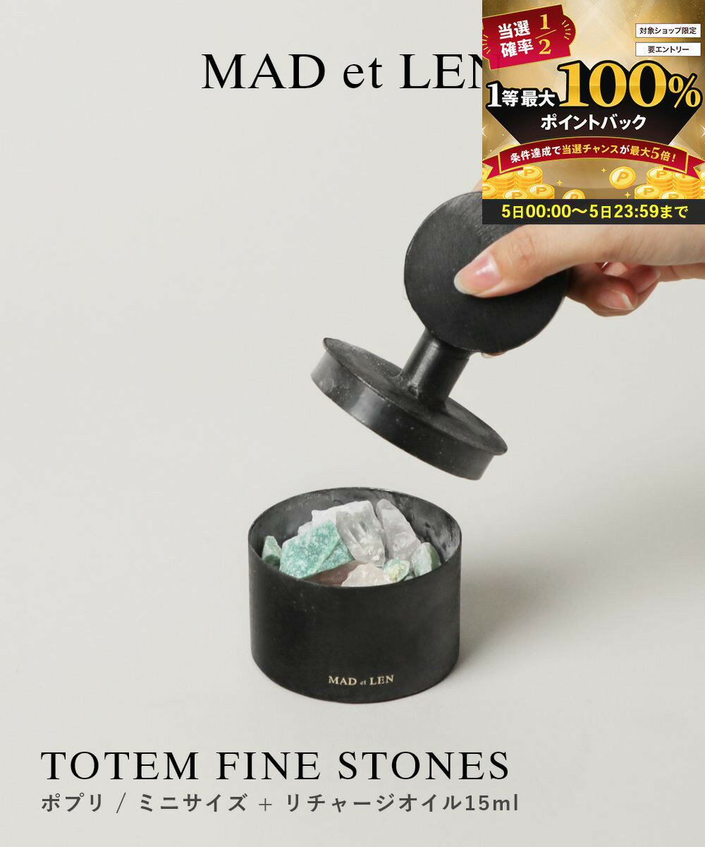 ITEM INFORMATIONマドエレン MAD et LEN TOTEM FINE STONES ユニセックス ポプリ南フランスで生まれたMAD et LEN(マドエレン)。重厚感のある無骨なアイアンの器がアイコンで、モロッコ職人の手作業によりひとつずつ生み出されています。天然素材から生み出される香りの物語と、経年劣化を楽しめる器の融合が嗅覚と触覚を魅了するアートです。天然石にはあらかじめ香り付けはされていません。香りを楽しむためには、オイルを垂らしてからご使用ください。カラー全8種類素材本体:鉄, 天然石(黒曜石、ローズアメジスト/ブルーソーダライト/クリスタル、カルサイト/アメジスト/エメラルド/クリスタル、エメラルド・アベンチュリン・クリスタル)リチャージオイル:SPIRITUELLE(スピリチェーレ) or TERRE NOIRE(テレノア)サイズ本体サイズ : 縦幅14cm 横幅8cm 厚8cm 箱サイズ : 縦幅17.5cm 横幅11cm 厚11cm 重量 : 約 590g セット内容リチャージオイル(15ml)特徴ブランド : マドエレン男女種別 : ユニセックス商品カテゴリーホームフレグランス > ポプリ生産国 : フランス管理コード備考※当社では、スタジオでストロボを使用して撮影しております。また、お客様のモニターを通してご覧になって頂いている為、実物を蛍光灯や自然光の下でご覧になった場合と色味が異なる場合がありますので、ご理解の上ご購入頂きますようお願い致します。※付属品は仕様変更等により、若干異なることがございます。※製造・入荷時期、カラーごとに生産国が多岐にわたる場合がございます。予めご了承ください。※稀に商品の保存箱・袋に破損(へこみ、汚れ等)などが見られる場合がございますが、商品本体に異常が無ければ、返品交換・キャンセル等はお受けしておりませんので、ご了承ください。※こちらの商品は、海外の正規ルートからの並行輸入品となります。国内の正規代理店で購入された場合と仕様が異なる場合がございます。予告なく商品画像とはパッケージが変更になる場合がございます。また、多少の傷や凹みがある可能性がございますので、予めご了承の上ご購入くださいませ。キーワードブランド関連商品【5日限定★エントリーで最大100%ポイントバック!当選確率1/2 】...【5日限定★エントリーで最大100%ポイントバック!当選確率1/2 】...【5日限定★エントリーで最大100%ポイントバック!当選確率1/2 】...24,800円24,800円24,800円【5日限定★エントリーで最大100%ポイントバック!当選確率1/2 】...【5日限定★エントリーで最大100%ポイントバック!当選確率1/2 】...【5日限定★エントリーで最大100%ポイントバック!当選確率1/2 】...6,490円24,800円24,800円【5日限定★エントリーで最大100%ポイントバック!当選確率1/2 】...【5日限定★エントリーで最大100%ポイントバック!当選確率1/2 】...【5日限定★エントリーで最大100%ポイントバック!当選確率1/2 】...29,800円25,000円25,000円【5日限定★エントリーで最大100%ポイントバック!当選確率1/2 】...【5日限定★エントリーで最大100%ポイントバック!当選確率1/2 】...【5日限定★エントリーで最大100%ポイントバック!当選確率1/2 】...21,800円30,800円19,800円 マドエレン/MAD et LENポプリTOTEM FINE STONES 全8種類 天然素材と職人から生み出される「不完全な美」南フランスで生まれたMAD et LEN(マドエレン)。重厚感のある無骨なアイアンの器がアイコンで、モロッコ職人の手作業によりひとつずつ生み出されています。天然素材から生み出される香りの物語と、経年劣化を楽しめる器の融合が嗅覚と触覚を魅了するアートです。天然石にはあらかじめ香り付けはされていません。香りを楽しむためには、オイルを垂らしてからご使用ください。性別素材本体:鉄, 天然石(黒曜石、ローズアメジスト/ブルーソーダライト/クリスタル、カルサイト/アメジスト/エメラルド/クリスタル、エメラルド・アベンチュリン・クリスタル)リチャージオイル:SPIRITUELLE(スピリチェーレ) or TERRE NOIRE(テレノア)SIZE本体サイズ : 縦幅14cm 横幅8cm 厚8cm 箱サイズ : 縦幅17.5cm 横幅11cm 厚11cm 重量 : 約 590g