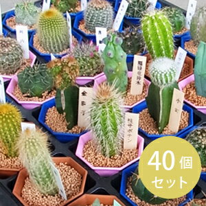 いずれも祝日を含みます(お盆・年末年始は別途規定)。 時間変更は送り状番号を元にお客様ご自身でお願いします(発送日の夕方以降可)。 24時間以内にメールが届かない場合は問合せフォームからご連絡ください。 ※写真はイメージです。生育状況や品種バランス等が異なる場合があります。ご了承ください。また、品種の希望ご指定などはお受け致しかねます。 ※その時の生育状況や在庫状況により状態の良いものを選んでお送りします。品種の数にばらつきが出ることもあります。※40種類をお送りするのではなく、おまかせミックスの40個になります。 ※軽いため配送時に鉢から苗が外れてしまう場合もございますが、すぐに植え直していただければ元気に育ちます。よほど状態の悪い場合にはご連絡ください。 植物 植物名 サボテン 種類 金獅子・半島玉・新天地・金晃丸・プカレンシス・小町・文鳥・麗蛇丸・般若・ヘルテリー・姫将軍・白角キリン・ヤマカル柱・竜神木・金紐・福緑竜神木・半琳丸・豊麗丸などをミックスでお届けします。 個数 40個入り ※40種類ではありません。 鑑賞時期 通年を通して楽しめます 植える場所 鉢植え 鉢 サイズ 2寸(約6センチ) 素材・色 ブルー、ピンク、イエローなどのプラスチックポット 置き場所 雨や雪の当たらない日の当たる屋外や室内 育て方 乾燥地帯に自生する植物ですので、乾燥気味で日の当たる場所を好みます。 ポイント! 水やりは春と秋は基本的に10日に1回程度、夏と冬は1ヵ月に1回程度で行いましょう。水の与えすぎは根腐れの原因になりますので注意しましょう。 水やり ★☆☆☆☆ 置き場所 ★★★☆☆ 耐寒性 ★★★☆☆ 日当たり ★★★☆☆