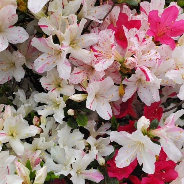 クルメツツジ 咲き分け一重 花木の苗木花木 庭木の苗/久留米ツツジ:常夏ツツジ(とこなつつつじ)樹高50cm根巻き久留米ツツジは樹幹を覆って花が咲く小輪多花性のツツジのグループです。常緑なので建物周りの植栽や庭木として大人気。日本ではゴールデンウィークに満開になるので、行楽地の植栽としても人気です。弱い光でも花色が引き立つので、室内での鉢物にもよく使われます。常夏は咲き分け品種で成木になるにつれ、白地にピンクの掃きこみ斑がはいったりと枝変わりが出てきます。幼木時は花色が偏り、白やピンク、赤になることがあります。タイプ:耐寒性常緑低木樹高:1〜1.5m開花期:4〜5月頃栽培適地:北海道南部以南植え付け適期:9〜11月、2〜4月栽培方法日当たり、水はけのよい場所に腐葉土をたっぷり施して植えてください。やや盛り土気味に植え付け、根元はピートモスなどで覆って乾燥防止してください。剪定は可能ですが、自然樹形のままのほうがきれいにまとまります。花芽分化は7〜8月なので、この頃以降はなるべく枝を切らないようにしてください。肥料は、1〜3月に寒肥として根元に腐葉土などを施し、花後の5月、7月下旬から8月上旬、10月にそれぞれ追肥として緩効性化成肥料を施してください。高温や乾燥にやや弱いので、夏場に西日が強くあたる場所はさけてください。樹高は入荷時期により多少変動する場合があります。お届け後は根を乾かさないように管理し、なるべく早く植えつけてください。お届け時期により開花が進んでいたり、開花後の状態となる場合がございます。写真は成長・開花時のイメージです。久留米ツツジ:常夏ツツジ(とこなつつつじ)樹高50cm根巻きの栽培ガイド花木・果樹の根巻き苗大型根巻き苗のお届け形態について